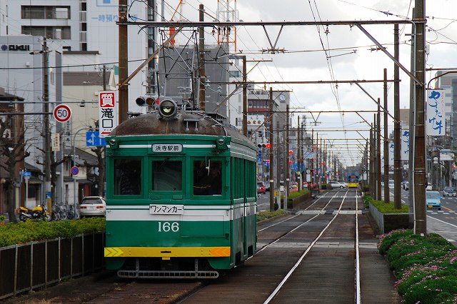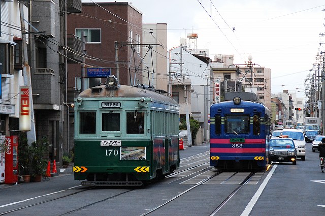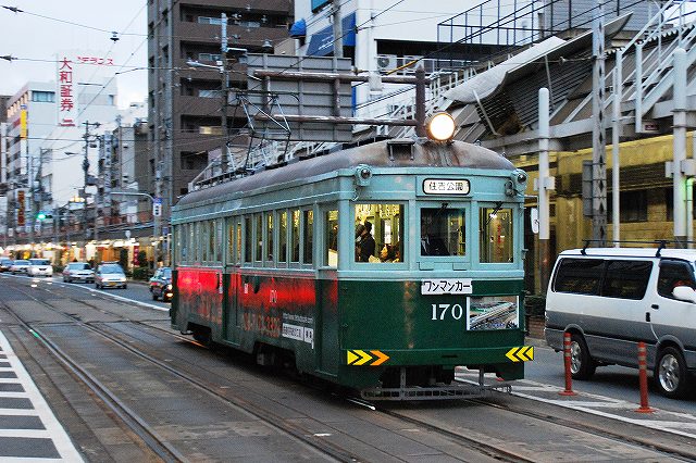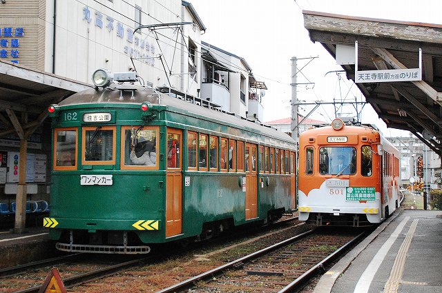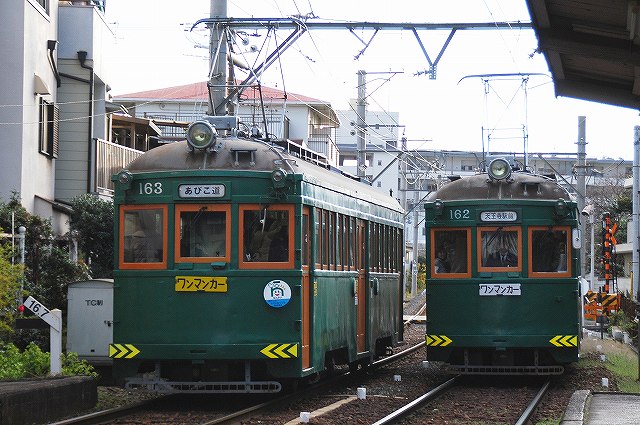 言い忘れていましたが、阪堺電軌の撮影/移動には全線1日フリー乗車券 てくてくきっぷを利用しています。 帝塚山四丁目駅へ移動し引き続き撮影。 この停留所は併用軌道区間のドンツキ(専用軌道に替わった所)にあるので。道幅が狭く歩道の無いこの区間に於いて、ホーム付近より安全に併用軌道の撮影が出来る。 旧南海大阪軌道線塗装のモ163とモ162が並ぶ。(阪堺電軌軌道は1980/昭55年に南海から分社化され誕生した会社) モ163には阪堺電軌のマスコットマークをあしらった副票が取り付けられている。 (左)南海旧塗装のモ170とすれ違っているのは351形(モ353)。 351形は旧式車の機器を利用し車体を501形(後述)並みのものに乗せ替えた車両で、1962~1963年に合計5両が登場しており、後年冷房化改造も行われている。 (右)501形(モ501) 1957年に、路面電車の最盛期と言える当時の最先端技術を用いた車両として5両が登場している。 前面は大阪市電3001形に似ているが、側面窓は当時の南海電車に似た一段降下窓を採用している。 501形のうち全面広告では無い車両には雲をかたどった塗装が施され(通称雲電車)、501形就役50周年記念のステッカーが貼られてある。 701形は1987~1995年の間に11両が製造された電車。当然ながら当初より冷房を搭載している。 601形は旧式車の一部器機を流用し701形並の主要器機及び車体等を新造した電車。1996~1998年に7両が登場している。 (左)車齢50年のモ501も、車齢80年のモ162と比べるとまだまだ「若手」? (中)161形のうち、全面広告やリバイバル塗装ではない車両は、やや明るめのグリーンに白帯の塗装。 (右)帝塚山四丁目から住吉方面の線路は、南海高野線と立体交差するためS字を書いた勾配になっている。 (左)東天下茶屋駅で降りて阿倍野清明神社へ寄ってみる。 (中)東天下茶屋駅付近にて。 (右)東天下茶屋駅の一角にあった馬車鉄道跡の石碑。 傍らの解説文等によると、1897(明30)に創立した大阪馬車鉄道(※)が、1900(明33)年に天王寺西門前-東天下茶屋間を開業したのが、今日の阪堺電軌軌道の始まりだそう。 その後馬車鉄道は住吉まで延長されるも、電化のため1908(明41)年に一旦廃止され。1910年に電車での営業が始まっている。 ※馬車鉄道とは、レール上に乗った車両を馬が引く形態の鉄道。蒸気機関の実用化/普及以前の鉄道の動力は馬だった。 鉄のレールの上を鉄の車輪により走行するため走行抵抗が小さく、通常の馬車より輸送力が大きい。 阿倍野駅へ移動。 (左)旧南海大阪軌道線塗装のモ162がやってきた (中)標準塗装のモ167と並ぶ。(歩行者信号が青の時に横断歩道より撮影) (右)今度は南海旧塗装のモ170が来た。 天王寺まで歩いて移動しつつ、折り返してきたモ167を撮影。 (左)天王寺駅前駅付近の状況。 画面右手方向、あべの筋の西側は再開発のため更地になっていた。 (中・右)前の電車に続き出発してゆくモ164。駅手前では、次の電車が待機中。