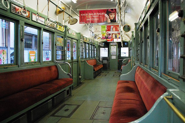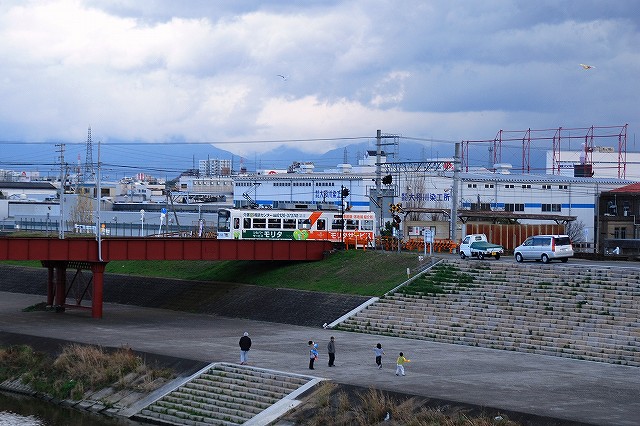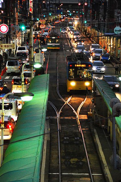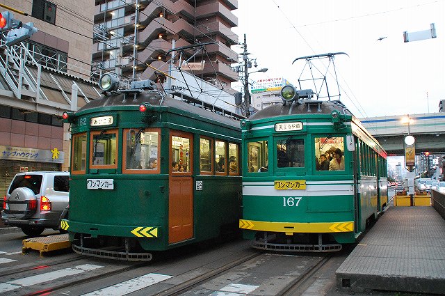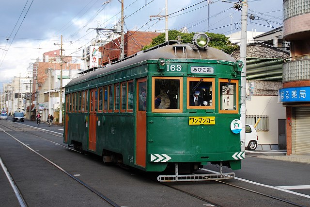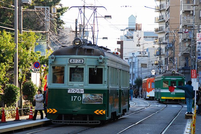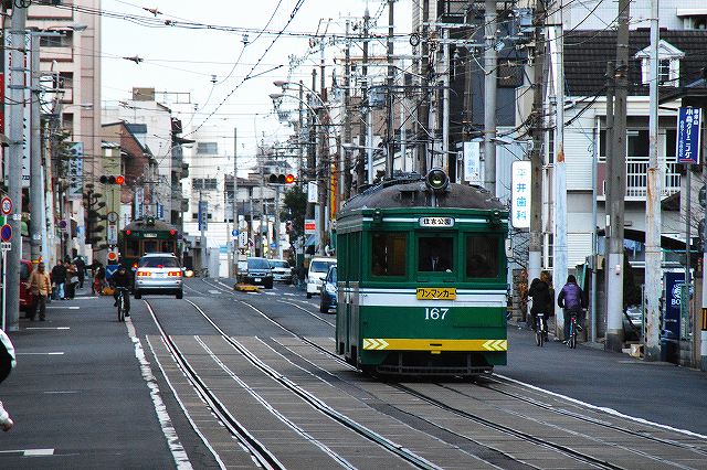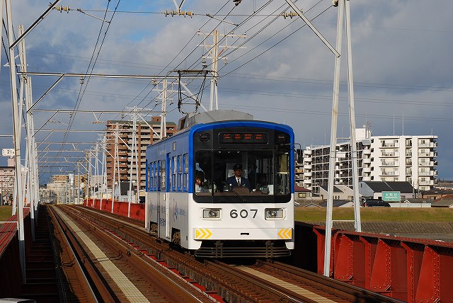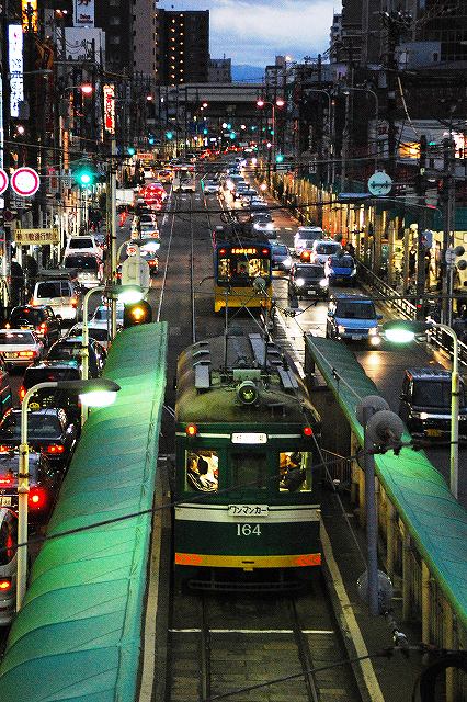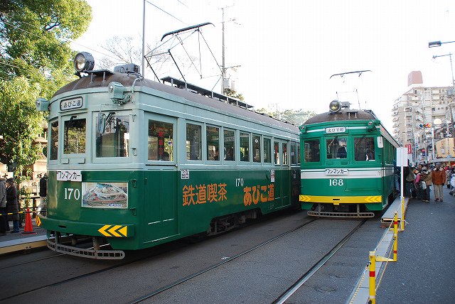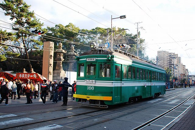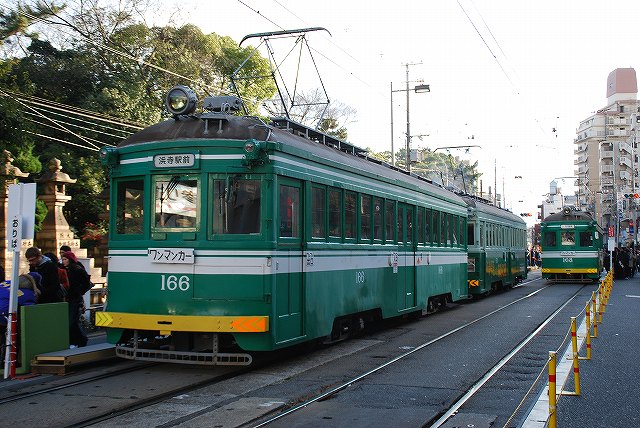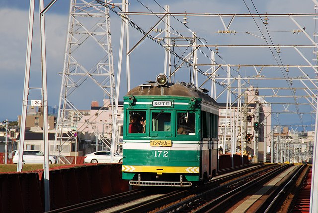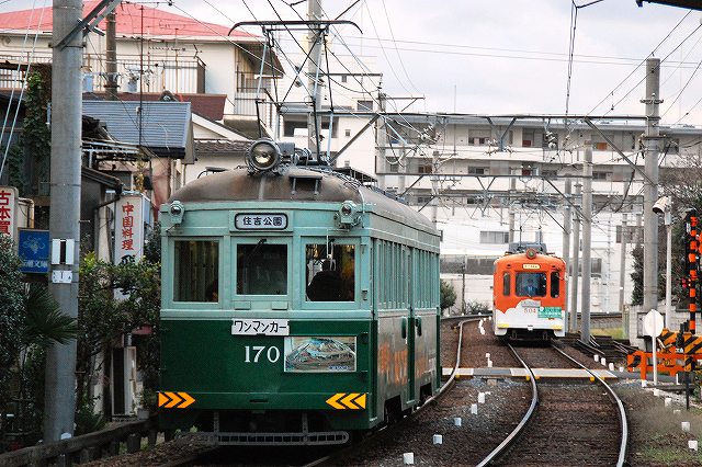 浜寺駅前から阪堺電軌にのり、専用軌道と併用軌道の境界である綾ノ町駅で撮影。 (左)351形とすれ違っている緑色の電車が今回のお目当ての161形電車。 非冷房の旧型車なので、普段の運用はラッシュ時など限られているのだが、お正月の時期は住吉大社への初詣輸送のため電車が総動員され、161形の姿も数多く見ることが出来る。 (右)堺市内の併用軌道区間は、グリーンベルト似て仕切られていて半ば専用軌道のよう。 利用者減で廃止も取り沙汰された堺市内の区間だが、堺市等が計画中で阪堺線と相互乗り入れする東西鉄軌道と合わせてLRT化(強引に言えば近代化)される予定で、今後が注目される所。 大和川駅まで移動し、大和川を渡る電車を撮影。 (左)お正月らしく、凧あげの様子を入れてみる。 川のわたり口の所に大和川駅がある。 (左)この大和川橋梁は、開業以来大切に使われている明治44年製の物。 (中)1931(昭6)年生まれのモ172が渡る。 (右)1998(平10)年生まれのモ607が渡る 阪堺電軌の阪堺線と上町線が交差する住吉付近に移動。(画面左右方向が住吉公園-天王寺の上町線で、前後方向が浜寺駅前-恵美須町の阪堺線。) 現在10両が在籍している161形のうち、モ161~168とモ170は1928(昭3)年製造と車齢が80年を越えており、名鉄510形(1926/大15年製造)や豊鉄3700形(1927/昭2年製造)が引退した今日では、日本で現役最古の電車である。(残るモ172は前述のように1931/昭6年製造) しかも、1両のみ動態保存的に…ではなく、有る程度纏まった数が現役に残っているのは特筆に価する…カモ? 歩行者天国とされ臨時の停留所が作られている住吉大社前に161形が3両が集結。 モ170は沿線の鉄道喫茶がスポンサーになり南海旧塗装に塗られている。 (左)住吉大社の前を通過するモ166 (中)上町線の折り返し駅である住吉公園駅に停車中のモ162。 (左)次発のため「中に誰も居ませんよ」状態だったスキに(^。^;)モ162の車内を撮影。古い電車独特の木と油の匂いがした。 つづく。