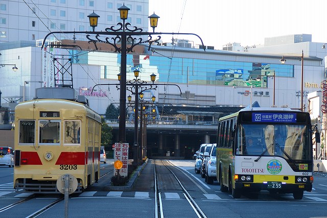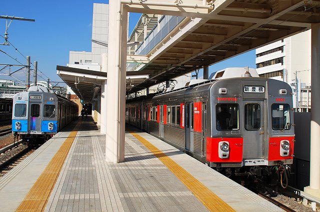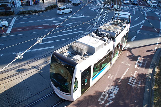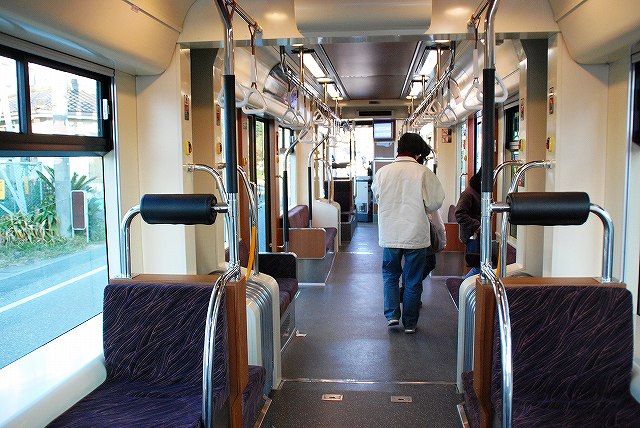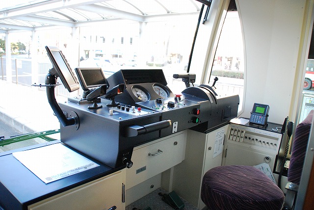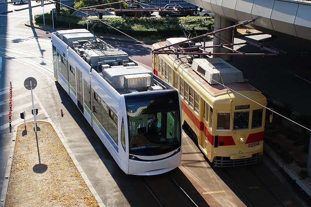 朝の500系一発目と二発目の間に、前回は車庫でお休み中だった「ほっトラム」の走行を撮影するため、徒歩にてウロウロして見ることに。 この日は豊橋鉄道HPでの告知どうりの時間に走行しており一安心(^_^;) (左)新川の交差点を曲がるT1000型「ほっトラム」 (右)乗り場と段差の無い全面低床を実現するため、三連接車体のうち両端の車両にのみ台車があるという特殊な構造をしている。 (左)札木電停付近を走る旧塗装を復元した3200型。 (右)八丁通の交差点で信号待ち中の、名鉄美濃町線から移籍してきた部分低床車800型。 800型はこの日午後再訪した時には車庫で休んでいたので、撮影できたのはこの時のみ。 (左)八丁通の交差点を曲がる「ほっトラム」 (右)元名鉄揖斐線の780型とすれ違う。 ここには、元豊橋鉄道(更に辿れば元名古屋市電)の3702が展示されている。 展示場所は有料エリア(体験・発見プラザ)内なので (右)行き先表示板はステッカーにて再現されていた。 (左)車内は現役末期のまま。 (中)運転台もそのまま。片方の運転台ではシュミレーター操作も出来る。 (右)床の一部はガラスに交換されていて、モーターの様子などを見ることが出来る。 豊橋駅前に戻る。結局の所500系撮影の合間に、豊橋駅前→新川→札木→ここにこ→豊橋駅前…と反時計回りに一回りした訳。 (左)丁度「ほっトラム」がやって来た。 (右)旧塗装車とすれ違い、折り返し出発してゆく「ほっトラム」。 場所は同じだけども時間は一気に飛んで、三発目の500系「のぞみ」及び在来線撮影後の豊橋駅前。 (左)今度は「ほっトラム」に乗車してみる。 (右)運転席はこんな感じ。制御装置はワンハンドル式のものだった (左)駅前発車直後に旧塗装車と擦れ違う。 停まっているバスは「なのはな号」のバス版かな? (右)車内はこんな感じ。終点赤岩口にて下車直前に撮った写真なので、少々雑なのはご勘弁。 …つづく。
