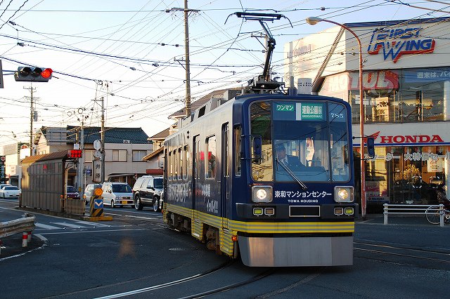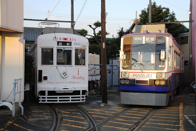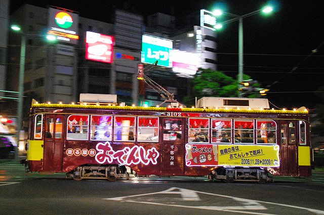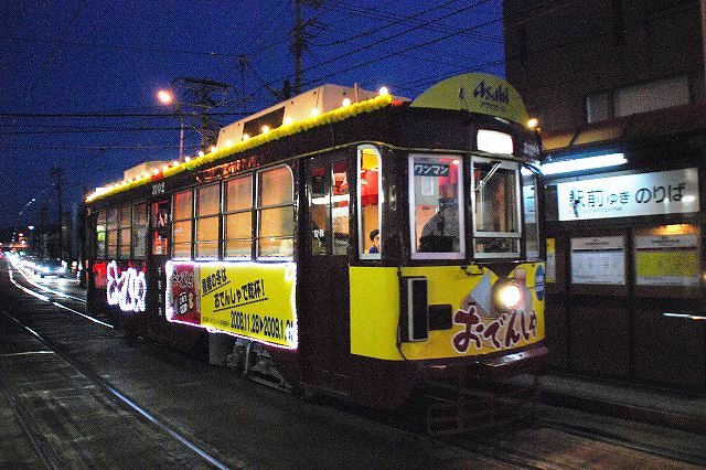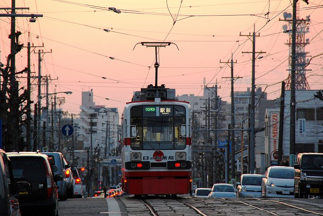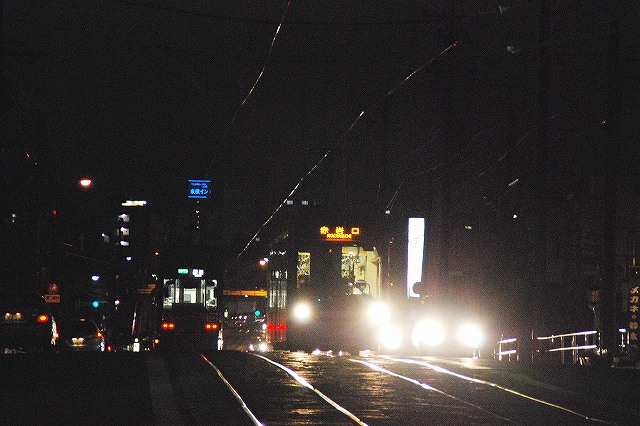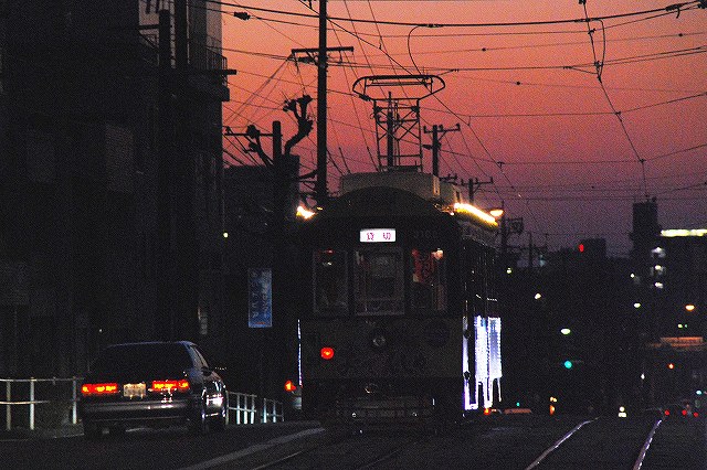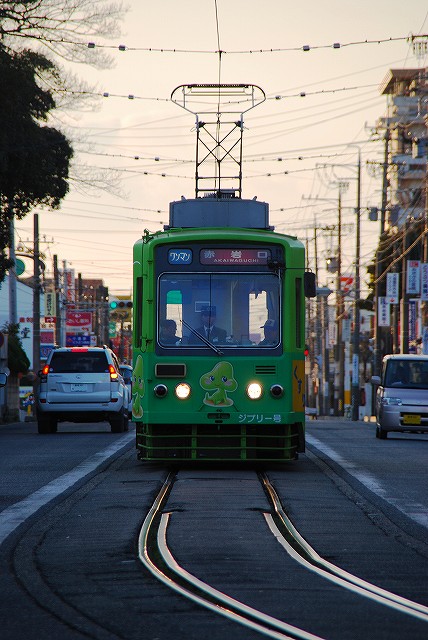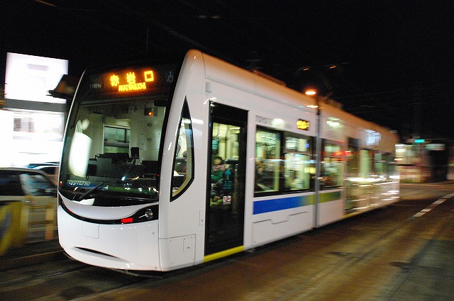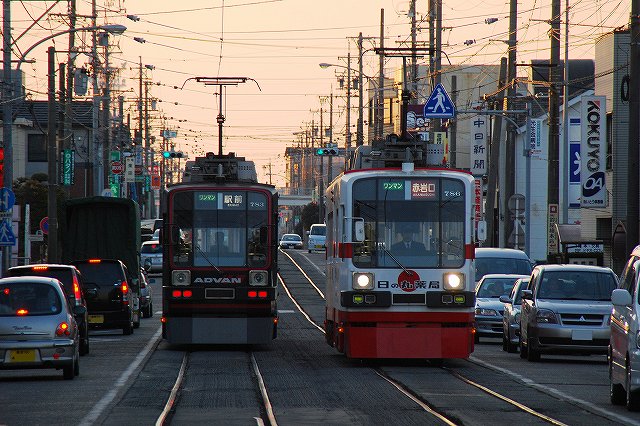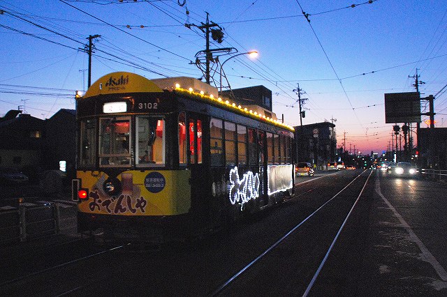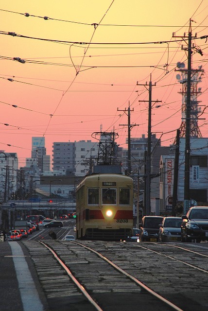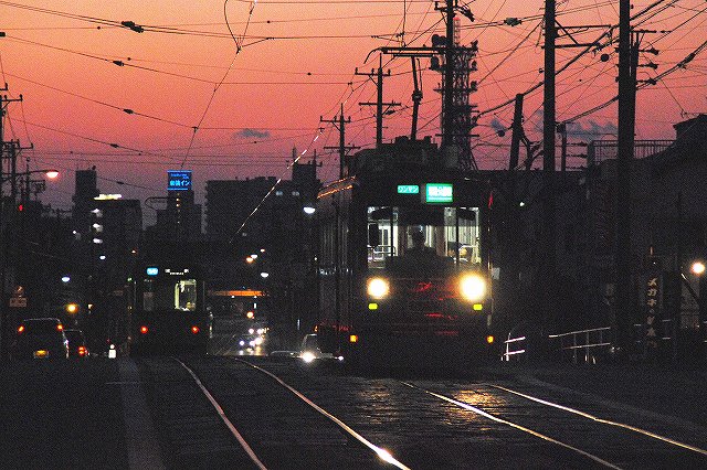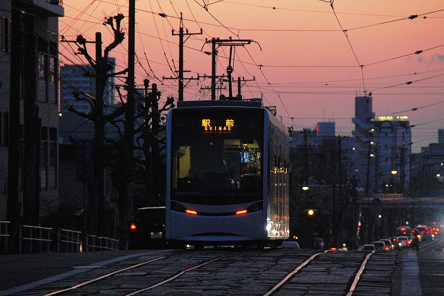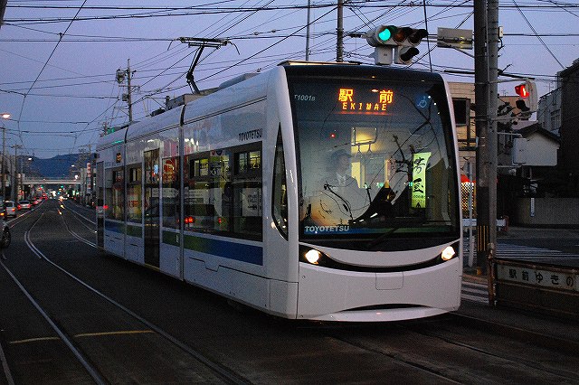 (左)赤岩口まで乗ってきた「ほっトラム」を見送り徒歩で線路沿いに移動してみる。 (中)Y字路の頂点付近の歩道よりカーブを利用して電車を正面より撮影。 やって来たのは元都電の3500形。 (右)井原を出発し、R11と言う日本の営業路線では最もきついカーブを曲がり運動公園前に向う780形。 ほっトラム及び800形の両LRVはこのカーブ(分岐)を曲がれないため赤岩口行きに限定されて運用される。 競輪場前電停に到着。 (左・中)この電停横には市内線の営業所及び、2両のみ停まれる小さな留置線がある。 (右)競輪場前電停東よりですれ違う780形。 駅前-競輪場前手前が複線区間で、競輪場前より先の区間は単線。 東田坂上電停へ移動し、前回は天候が微妙でできなかった夕焼けを背景にした写真を撮ってみる。 (左)東田の坂を登ってくる旧塗装車。 (右)東田の坂を下る780形。軌道敷内は自動車乗り入れ禁止なので、渋滞はカンケーなし(^。^) (左・中)ほっトラムがやって来た (右)3500形と780形がすれ違う。 おでんしゃ@回送キター。 車両は名古屋市電唯一の生き残りである3102。 明らかに無理な明るさ(と言うか暗さ(^。^;))になってきたけど、ほっトラムが駅前から戻ってくるまで粘ってみる。 (左)780形とすれ違う。 (右)出発する所を後方より流し撮りしてみる。 豊橋駅前へ移動。駅前の交差点を曲がって行くところをイン側の歩道より流し撮り。 この場所は信号待ちの車のヘッドライトの光を照明に利用できるものの、タイミングが悪いと左折の車がカブって来ると言う諸刃の剣なポイント(^。^) (左)780形 (右)「おでんしゃ」、車内では既に宴会実施中。 …と言う事で、これにて撤収。 帰りは在来線の快速にて帰還しました。