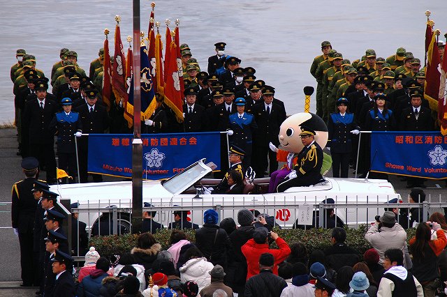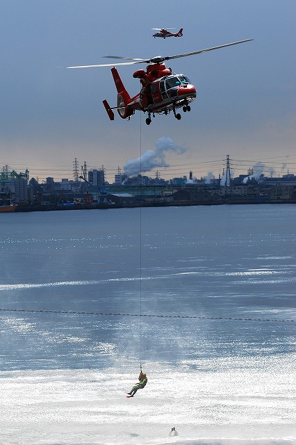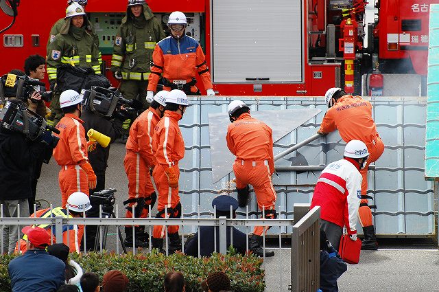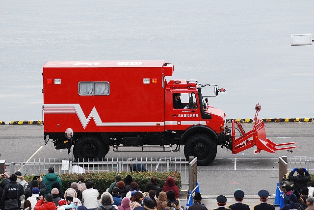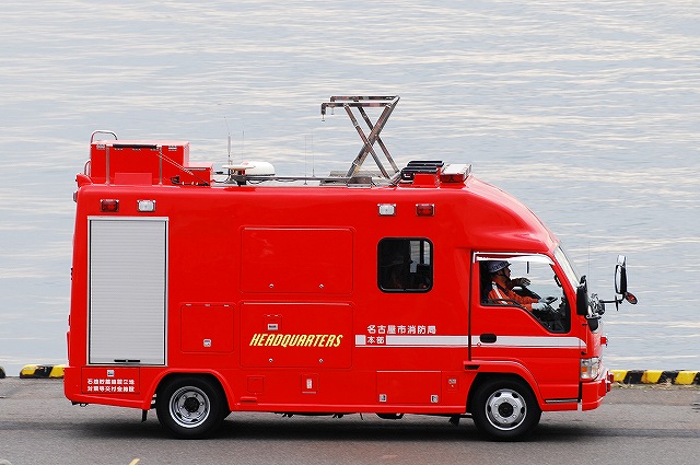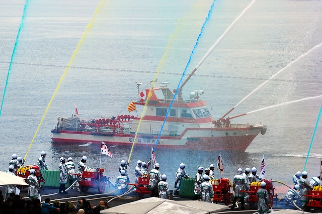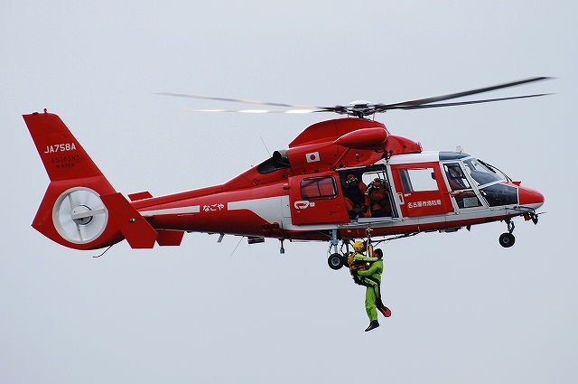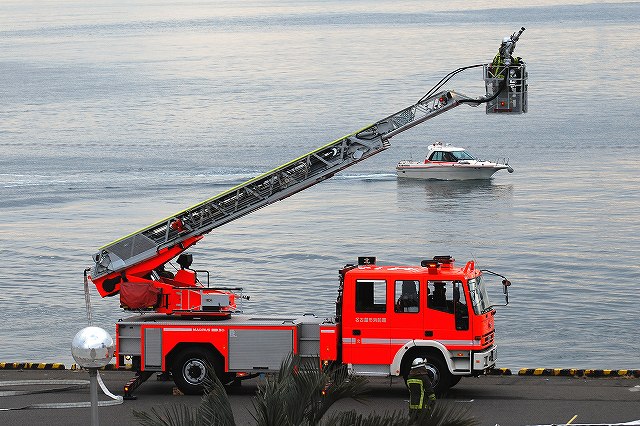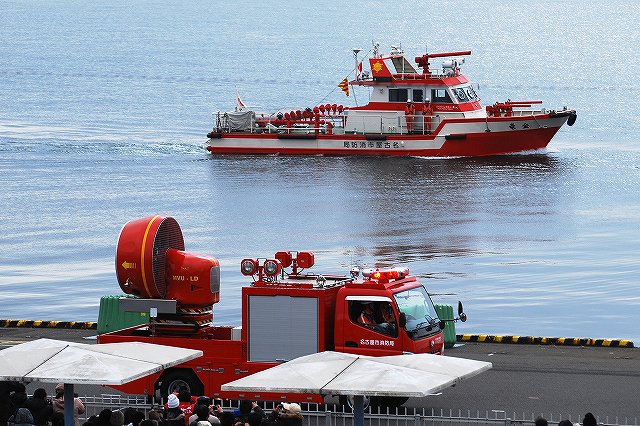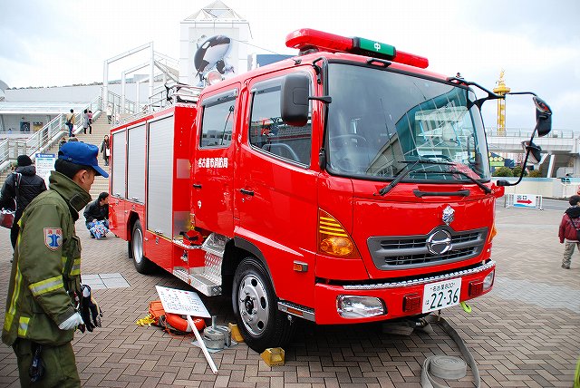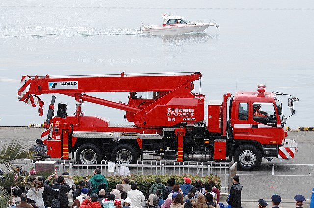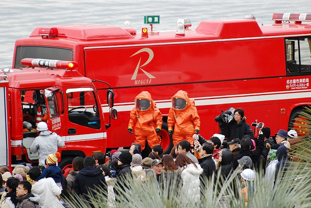 消防訓練前段は、大規模震災が発生したとして各種レスキューの状況を展示。 (左)名古屋市消防本部の指揮車が登場 (右)上空より航空偵察を実施する名古屋市消防局の2機のドーファン「なごや2」(手前)と「なごや」 JA758A「なごや」(アエロスパシアルAS365N3ドーファン)が海上の要救助者を吊り上げる。 (中)後方に「なごや2」が見える 各種消防車両が出動 (右)防護服を着た隊員さんもいた。 (左)会場中央の「現場」 (右)カッターで障害物を切断中 (左)救助した負傷者をJA6779「なごや2」(アエロスパシアルAS365N2ドーファン)がストレッチャーごと吊り上げ。 (右)離脱してゆく「なごや2」 マギルスのはしご車が展開中 合図と共に放水開始。水の着色には環境に影響のないものを使用しているとのこと。 (左・右)名古屋市の「金竜」と海保の「しらいと」や消防団の可搬式ポンプ等も参加していた。 (左)一斉放水終了後。会場正面の海上でホバリングしていた消防ヘリは北へ向けてブレイクしていった。 (右)参列者及び市民に向けて敬礼。客席ではおチビさんが答礼中 (^。^) 埠頭の一角に設けられていた「ふれあい広場」では消防車両の展示等が実施されていた。 (左)はしご車 (中)ポンプ車 (右)高規格型救急車 最後になりましたが、当日現地にてお世話になった皆様有難う御座いました。 本投稿及び添付した写真は私ちゃりんこジョニーの著作物であり、他のサイト・掲示板及びブログ等への無断転載を禁じる。 特に、かつては「中華人民共和国萬歳」現在は「異常な愛情」と言う名のパクりブログを運営している、支那人窃盗常習犯sunbinsiftに対しては強く抗議する。