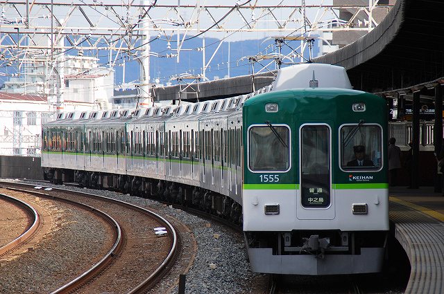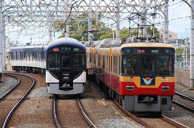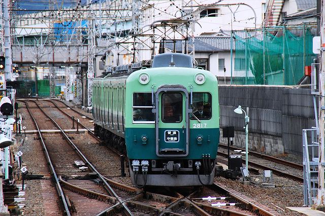 複々線のS字コーナーでお馴染大和田駅へ移動。 (左)8030型(旧3000系、現在は8000系に編入)ようやく登場(^。^) (中)大和田を通過してゆく6000系の中之島行き急行 (右)同じく8000系新塗装車の出町柳行き特急。 特急と急行双方に使用される3扉転換クロスシート車9000系。 (左)新塗装車も登場している。 (右)旧塗装車はグリーン濃淡の普通車用塗装に水色の帯が追加された塗装だった。 (左)3000系と8000系の擦れ違い。 (右)1500系更新車の新塗装車。 (左・中)8030型が淀屋橋から戻ってきた。 (右)3000系の出町柳行き急行を撮影して次の場所へ転進。 1500系更新車と8000系が擦れ違う。 この駅からは宇治線が分岐している。 (左)宇治駅へ向かう2800系 (右)三条へ到着した2800系。 こちらの編成は車掌側の正面窓が二段のままで3よく原型を残していた。 (左)中書島へ到着した8030型の特急。 (右)通過列車用に比較的大きなカント(線路の傾斜)が付いた本線上に停車する。 かつては大阪(京橋)-京都(七条)間はノンストップだった京阪特急だが、攻勢を強めるJRの新快速に速度面では太刀打ちできない為、途中の停車駅を増やし乗客を「拾う」作用方針転換を余儀なくされた。 (左)7200系新塗装車の淀屋橋行き特急。 (右)2200系新塗装車の中之島行き普通。 3000系の淀屋橋行き急行。 …と言う事でこれまた一通り撮れたので、次の目的地へと転進! PR