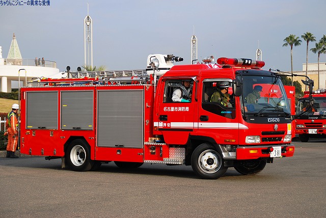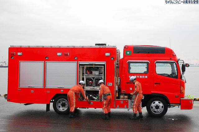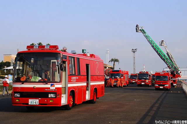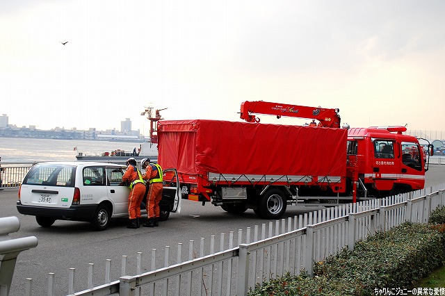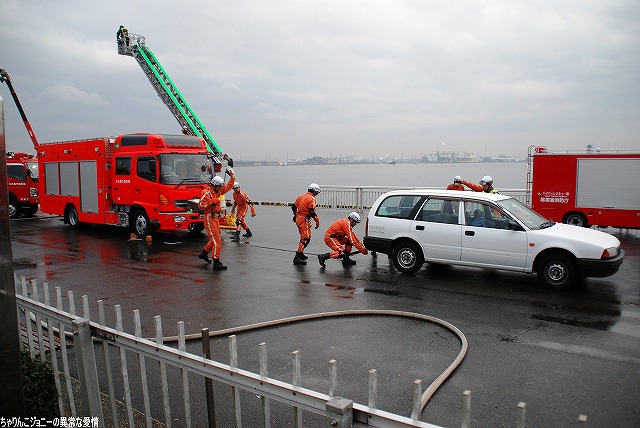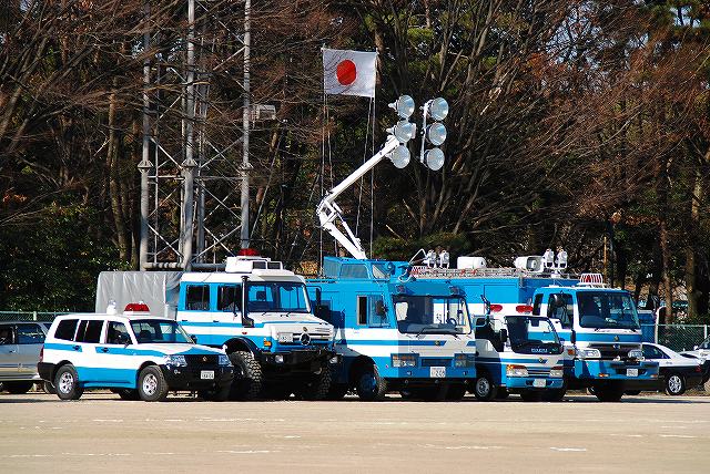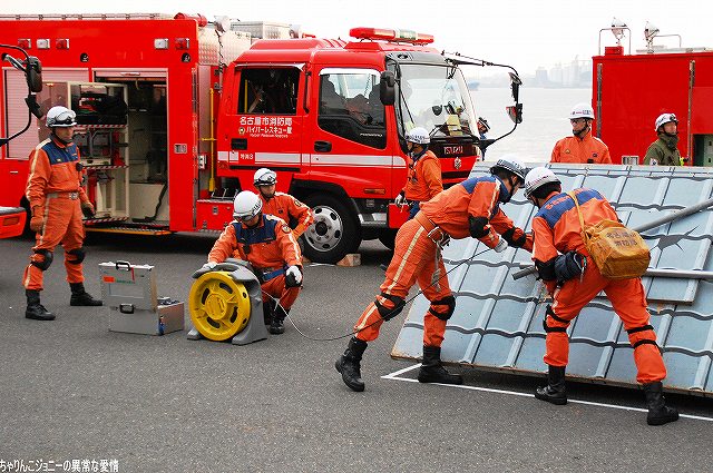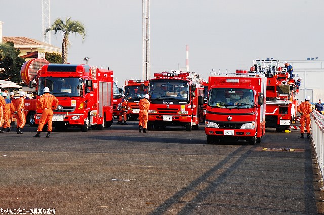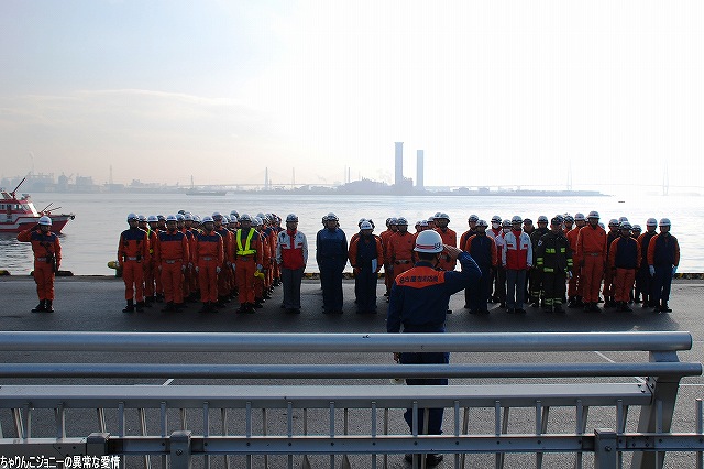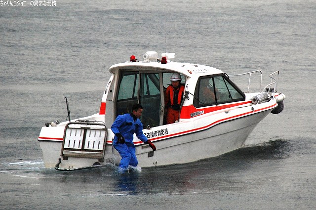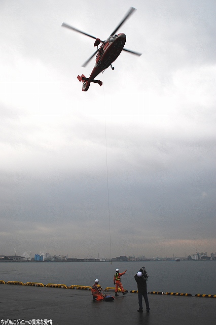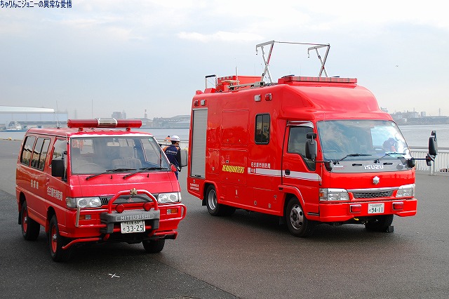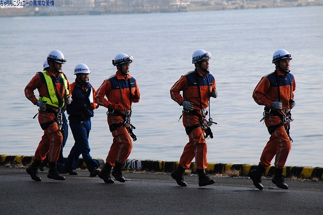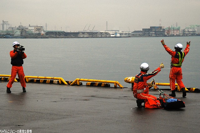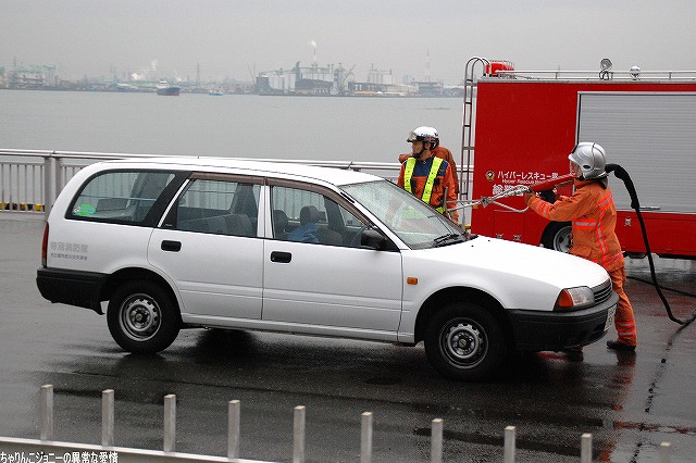 ワタシ警察のイベントは今回初めてなので、何時にも増して内容の薄いレポートになっているのはご勘弁を(^。^;) (左)視閲用のオープンカーが会場に到着。…ってこの時は幌被ってますけどね。 (右)会場に整列した白バイ。ホンダVFR…と車体に書いてあった(^。^;) 警察官の皆さんも整列し、本番に先立ち予行を実施。 (左)画面中央の機動隊員が手にしているのはMP5J機関拳銃(サブマシンガン) (中)機動隊員の盾は、樹脂製の透明なものに更新されていた。 (右)国旗を掲揚中 (左)分列行進のため駆け足で移動。 (右)車両も移動を開始。写真はRV車がベースのパトカー。 (左)制服警官(と言う表現でいいのかな?)の分列行進。 (右)女性警官(と場内放送で言っていた)の分列行進。 (左)機動隊の分列行進 (右)一部隊員が携行していた機関拳銃。 MP5Jはドイツのヘッケラー&コッホ社製のサブマシンガンで、本体上に光学サイトを載せているよう。 ホルスター内の拳銃は、一般のお巡りさん同様ニューナンブのリボルバーかな? (左)分列行進を終えた部隊は、会場後方で足踏みしつつ待機。 (右)警察犬の分列行進 (左)鑑識課の皆さんかな? (右)交通機動隊の皆さんかな?(ちゃんと場内放送聞いとけよ!(^。^;)) (左)オフロードバイクの分列行進。災害時の情報収集などが期待されているよう。 (右)白バイの分列行進。赤いツナギの人は女性隊員。 (左)パトカーの分列行進。 (右)覆面パトカーの分列行進。先頭の車はスカイライン。 (左)覆面パトカー@インプレッサ。速そう? (右)最後にパトカーの分列行進。 (左)会場後方にて待機していた部隊が、横一列になって一斉に前進。 (右)最初の位置に戻って再び整列。 この後、国旗の降納等の後予行は無事終了。 …つづく。 本投稿及び添付した写真は私ちゃりんこジョニーの著作物であり、他のサイト・掲示板及びブログ等への無断転載を禁じる。 特に、かつては「中華人民共和国萬歳」現在は「異常な愛情」と言う名のパクりブログを運営している、支那人窃盗常習犯sunbinsiftに対しては強く抗議する。 2回目の予行では大まかな段取りを確認していたよう。 (左)「事故車両」役の赤いトラックは「輸送車」と呼ばれる消防の車両で、主にボートの輸送に用いられる物だそう。 訓練とは言え、消防車両が事故ってるのもナンなので、本番の時には何処かのトラックを借りてくるのかな? (右)ファイバースコープを用いて、「倒壊家屋」の内部を検索中。 (左)照明が焚かれていた (中)「救助」の段取りを確認中。 (右)救助車に搭載されたクレーンにより、要救助者を救出。 3回目の予行ではほぼ本番通の訓練を実施。 (左)「次行って見よう!」ってことで、一旦待機位置に戻っていた「倒壊家屋」が登場。 (右)「飛竜」より、要救助者役の消防士さんがドボン! ちなみにただでさえ寒かったのに、この辺りから雨が降り始めてます。 3回目の予行にはヘリも登場 (左)飛来したのは名古屋市消防局が保有する2機のドーファンのうち、JA6779「なごや2」が飛来していた。 (中)消防士さんをホイスト降下させながら接近。 (右)海上の「要救助者」を吊り上げた。 (左)新型の救助車が2台並んで登場。 (右)側面のシャッターを開けて機材を取り出す。 (左)装備しているウインチを用いて「事故車両」を引き剥がす。 (右)ウォーターカッターを用いて車体を切断。(実際には切断せず。本番時はスクラップの車両を用意して切断する筈) 救出した「要救助者」(ダミー君)をストレッチャーに固定しヘリにて吊り上げる。 これは多分予行時のみの「スペシャル」でしょうね。 本投稿及び添付した写真は私ちゃりんこジョニーの著作物であり、他のサイト・掲示板及びブログ等への無断転載を禁じる。 特に、かつては「中華人民共和国萬歳」現在は「異常な愛情」と言う名のパクりブログを運営している、支那人窃盗常習犯sunbinsiftに対しては強く抗議する。 (^。^;)、この日は出初式の予行を撮りに、名古屋港ガーデン埠頭へ行って来ました。 本番当日では不可能な適宜場所を移動しながらの撮影が出来ました。 写真は2台の指揮車。奥の大きな方は名古屋市消防本部の指揮車。 (左)集合がかかり、駆け足で移動するハイパーレスキュー隊の皆さん。 (右)訓練を前にしての訓示中。 この日は出初式の後半に行われる「消防訓練」(要するに「訓練展示」)のうち、前段の「救助訓練」の予行を実施。 (左)一斉放水の段取りを確認中の、名古屋市の消防艇「金竜」(左側)と海保の消防艇「しらいと」(右側)。 (右)予行は3回行われ、1回目の予行では車両の停止位置などを確認。 (左)手前に停まっているバスのような車両は災害救援車。主に水難救助へ対応している車両との事で、車内では救助隊員がウェットスーツ等に着替る事が出来たりする。 (右)災害救援車の影で防護服を装着中 (左)海上では、消防艇の「分列行進」の予行が行われていた。 (右)先頭は名古屋市消防局の「飛竜」。指揮等に使われているよう。 (左)続いて名古屋市消防局の消防艇「飛竜」