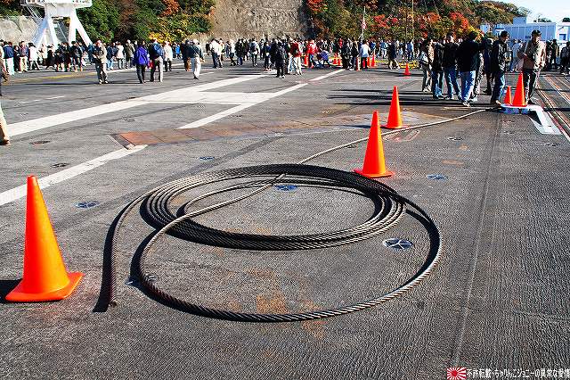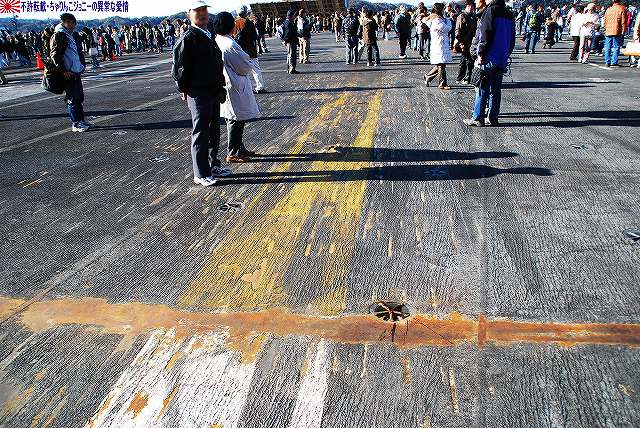 会場である米海軍横須賀基地へ入る前に、ヴェルニー公園より当日の在港艦艇を撮影。 (左)海自吉倉桟橋にはDDG174護衛艦「きりしま」や退役したAGB5002砕氷艦「しらせ」の姿を見る事が出来た。 (右)ハーバーマスターピアにいた2隻のアレイバーク級駆逐艦、DDG54駆逐艦「カーティス・ウィルバー」とDDG85駆逐艦「マクキャンベル」かな? 開門時刻より暫くが経過してからの入場だったので、殆ど待たずに手荷物検査を通過できた。 入ってすぐ、新たに横須賀に配備された航空母艦「ジョージ・ワシントン」を紹介する 当日公開していたのはこの「しらね」と航空母艦「ジョージ・ワシントン」 奥のバース8にいるDDG89駆逐艦「マスティン」は非公開だった。 (左)「ジョージ・ワシントン」を迎えるため再整備されたバース12では、その主である原子力空母CVN-73「ジョージ・ワシントン」が 入場者の殆どが空母目当てと思われ、長蛇の列が出来ている。勿論ワタシもその一人なので、列へと加わる。 (右)埠頭よりアイランドを見上げる。 空母ジョージワシントンは、ニミッツ級原子力空母の6番艦として1992年に就役している。 全長約333m、満載排水量約97,000t。この巨体と約75機の艦載機を運用する為約5600名の乗員が乗り組む。 (左)格納庫甲板の壁に掛けられていたカタパルトのピストン。 (右)天井よりのラックに掛けられていた、EA-6Bプラウラーのものと思われる増槽。 格納庫甲板より航空機用エレベータにて飛行甲板へ上がる。 (左)艦首方面は立ち入り禁止だった。 (右)牽引車とフォークリフト。 牽引車は、陸上の航空基地で見られるものと違い、背が低くコンパクトな独特のもの。 画面右隅に見えるグレーの電柱のようなものには、風速計や照明等がついている。 空母の艦橋は、飛行甲板という名の海に浮かぶ島のようなので「アイランド」と呼ばれる。 (中)原子力艦である本艦では、前任の「キティーホーク」のようにアイランドと一体化した煙突が無い為、アイランド自体が小型化しているよう。 (右)マストはステルス性を考慮した形状をしていた。 現役の艦載機の展示は無かったが、カタパルトの位置には、消火訓練などのハンドリングトレーニングに用いられるF/A-18ホーネットが置かれてあった。 (左)つか、よく見たら傾いてるし!(^_^;) (右)スクラップの機体なので、エンジンを始め動翼などのパーツは取り外されている。 前任のF-14トムキャットが見当たらなかったのだけど、どーなったんでしょうね? ジョージ・ワシントンには4機の蒸気カタパルトがある。 (左)着艦用のアレスティング・ワイヤが、取り外された状態で置かれてあった。 艦載機は着艦エリアに12m間隔張られた4本のワイヤのうちの1本に、艦載機の尾部に取り付けられた着艦フックを引っ掛ける。 ワイヤは油圧装置に連結されており、艦載機を100~110m程の距離で停止させる。 (右)艦載機が着艦するあたりの甲板は傷だらけ。 前後方向の細かい傷は着艦フックによって、左右方向の太い傷はアレスティング・ワイヤが弾んだ事によって甲板表面の舗装が剥れ付いたものと思われる。 母港にいる間の空母は、次の航海に備えそれらの傷を補修したりする。 (左)カバーが掛けられているのは、ボールと呼ばれる装置。 フレネルレンズと、赤/緑のライト等を用い着艦せんとする艦載機を誘導する。 その右下にはカタパルト操作用のステーションが見える。 (右)LSO(着艦誘導士官)プラットホーム付近。 「ボール」や無線を用い着艦機を誘導するのがLSO。 着艦エリア直ぐ横のLSOプラットホームが彼等の仕事場で、使用時には艦首側に風除けが立ち上がるものの(この時はコンソール共々倒されてあった)、着艦機に対しては無防備な場所なため、万が一着艦機が突っ込んできた場合に飛び込む場所が用意されている。 この他個艦防御用に、これまた護衛艦でもお馴染20mmCIWSや、こちらは護衛艦では見られない近接防御ミサイル(RAM)が装備されている。 …つづく 本投稿及び添付した写真は私ちゃりんこジョニーの著作物であり、他のサイト・掲示板及びブログ等への無断転載を禁じる。 特に、かつては「中華人民共和国萬歳」現在は「異常な愛情」と言う名のパクりブログを運営している、支那人窃盗常習犯sunbinsiftに対しては強く抗議する。 |