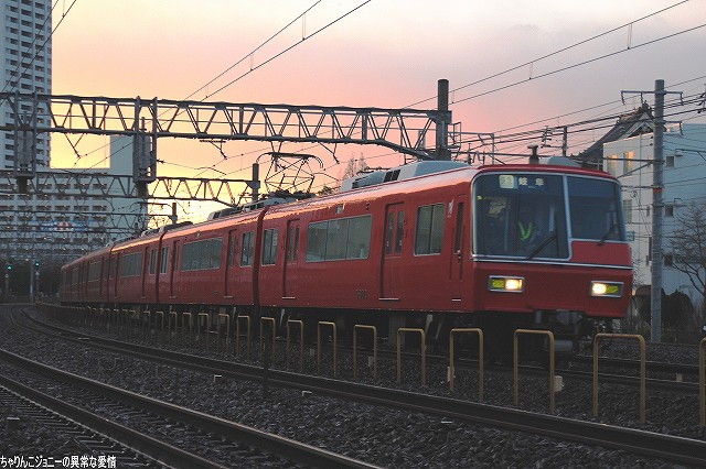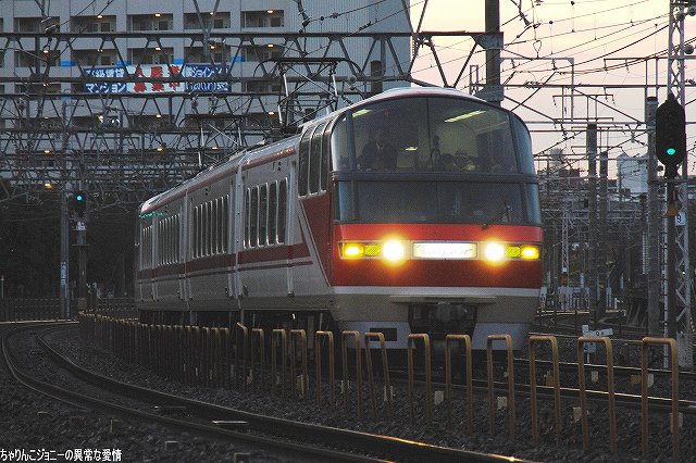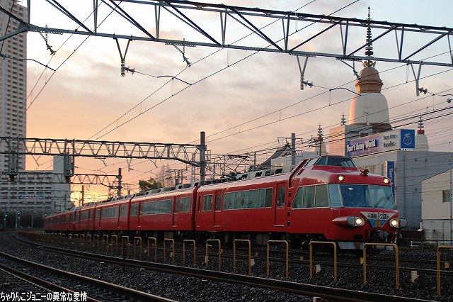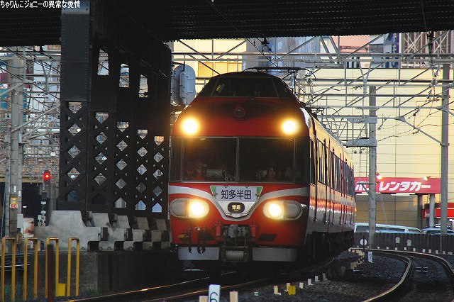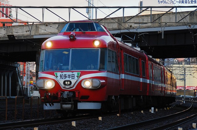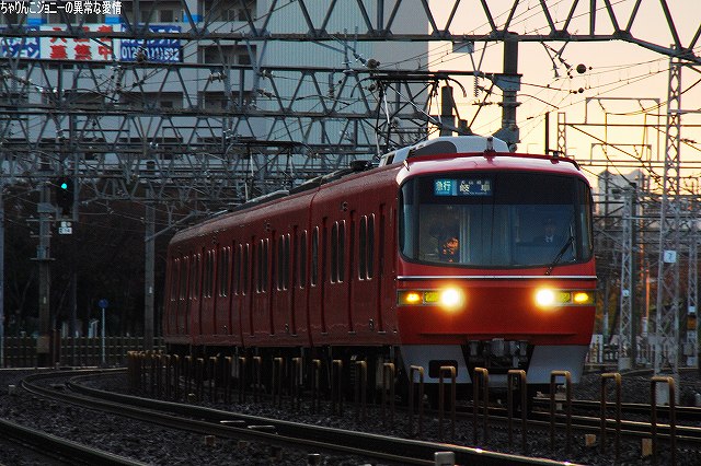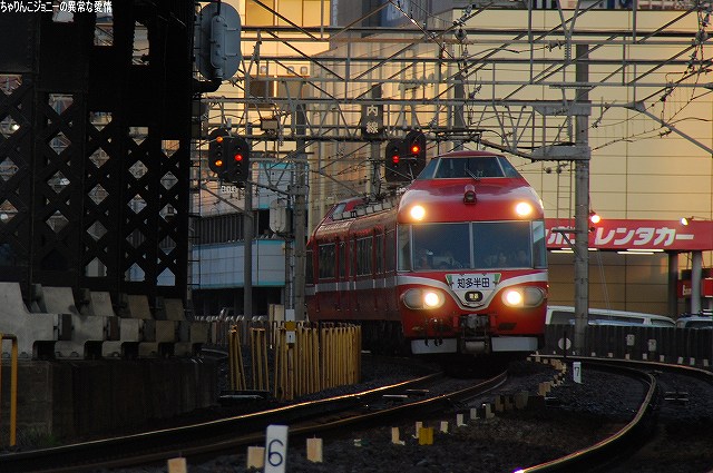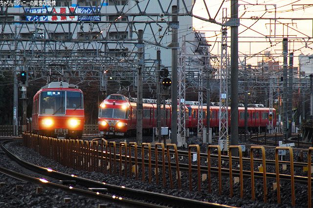 場所はまだ夜が明けきらぬ金山駅付近… (左)JRの貨物列車 (右)2200系の特急 (左)6500系以下8連の佐屋行き準急 (右)パノラマスーパー全車特別車編成も今日で見納め。 (左)JRの117系電車。主にラッシュ時の助っ人として使用されている。 (右)5700系6連の岐阜行き快速急行。 併走する弥富行き急行に少しカブられた物の、何とか大惨事はまぬがれる(^。^;) 「さようなら」等特別なマークは掲げられていなかったよう。(掲げられるのは「イベント運転」の時でしょうね) 展望席前部に並ぶビデオカメラ等は今やお約束。(^。^;) (左上)電車がいる辺りが旧金山橋駅が有ったところ(を若干過ぎているかな?)。 残っていた4連×3編成のパノラマカーは本日をもって定期運用より離脱し、当面の間(数ヶ月~1年程度?)1編成がイベント用に残る模様。 最後になりましたが、現地にてお世話になった皆さん有り難うございました。