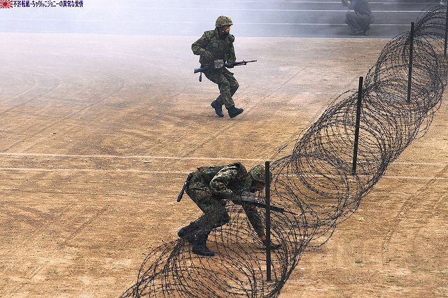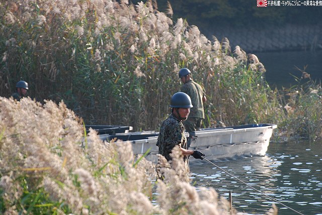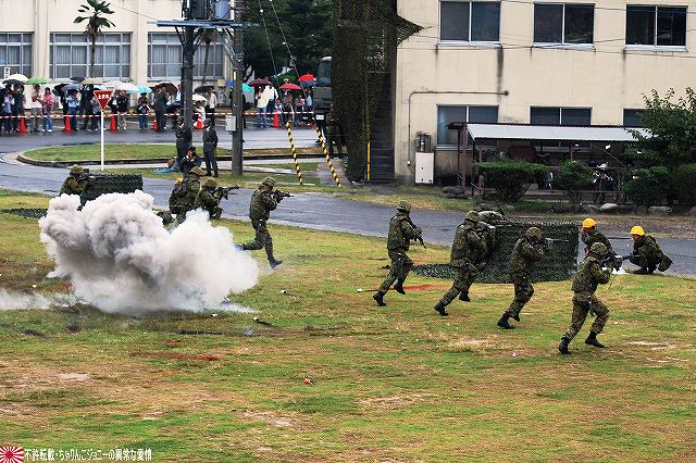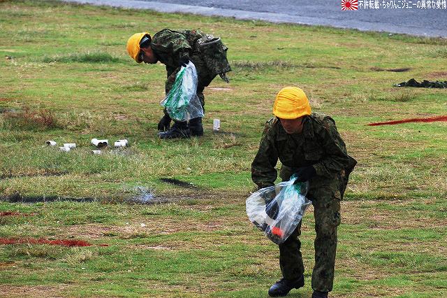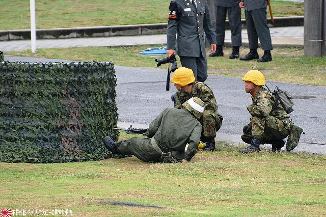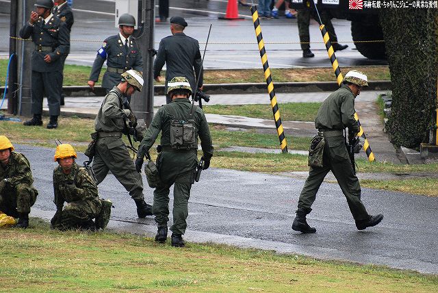 今回の模擬戦に登場したヘリはこのときのOH-6Dのみ。 偵察バイク登場 (左)支援射撃を実施するFH-70。微妙に砲焔を捉えている(^。^) (右)黄色いヘルメットカバーの隊員さんは、弾着を模した発煙筒を投げる係。 (左) (右)狙撃チームは狙撃手(手前)と観測手(奥)の二人一組で構成される。 この後、先ほどの「敵指揮官」を狙撃にて排除した。 (左)「敵装甲車」(82式指揮通信車)登場。重機関銃の発射焔はタイミングが合わず捉えられなかった。 (中)74式戦車登場 74式はその後、目の前で空砲射撃を実施したものの、見事に撮影失敗。何か今回こんなんばっかしですが、3連戦の3日目で集中力が途切れていたと言う事でヒトツご勘弁を(^_^;)ゞ (左)姿勢制御装置の動作を展示中。 (右)軽装甲機動車と96式装輪装甲車が戦車を超越 (左)先ず2名が降車して… (右)鉄条網の手前で伏せる オレを踏み台にしたぁ! …と伏せた隊員さんを踏み台にして鉄条網をジャンプ。 よく見ると後方で「負傷者」が発生している。 (左)「踏み台」にされた隊員も合流して一斉射撃 (右)その後敵陣へと突入し状況終了。 (左)敵陣には敵兵の死体が残されて… (右)あ、生き返った(^。^) (左)お疲れ様でした~ (右)発炎筒の燃え殻を回収中 (左)状況終了後の参加車両 (右)空砲射撃後の点検中 つづく。 本投稿及び添付した写真は私ちゃりんこジョニーの著作物であり、他のサイト・掲示板及びブログ等への無断転載を禁じる。 特に、かつては「中華人民共和国萬歳」現在は「異常な愛情」と言う名のパクりブログを運営している、支那人窃盗常習犯sunbinsiftに対しては強く抗議する。 |