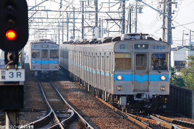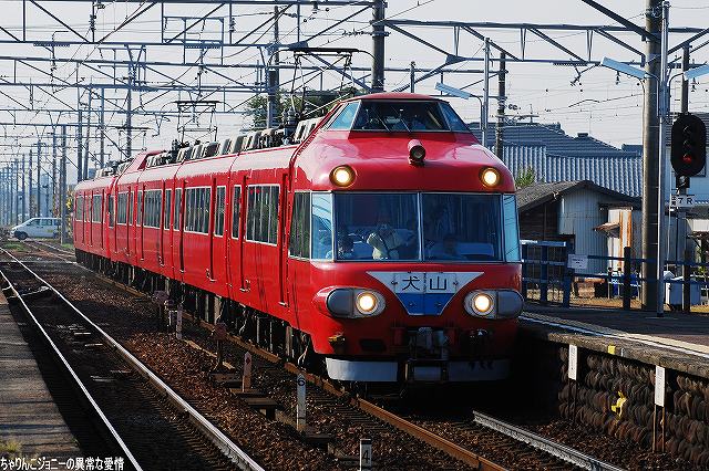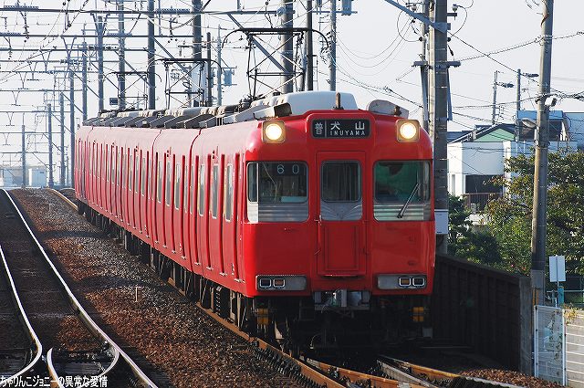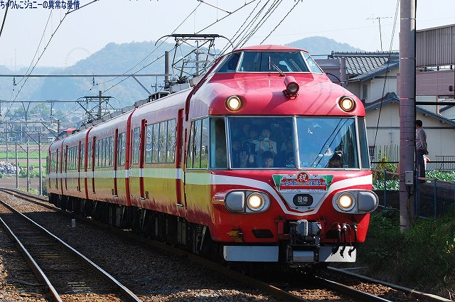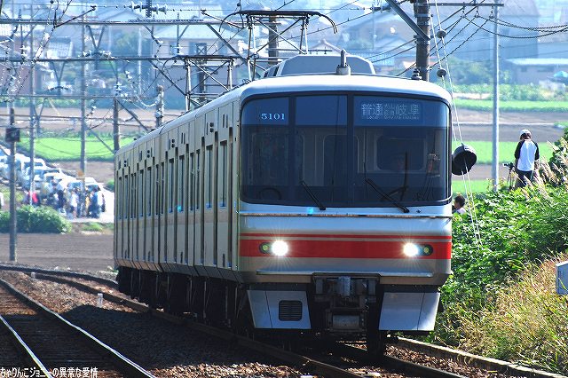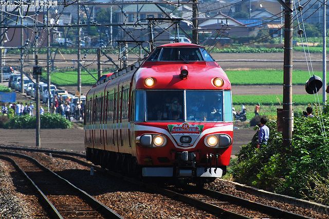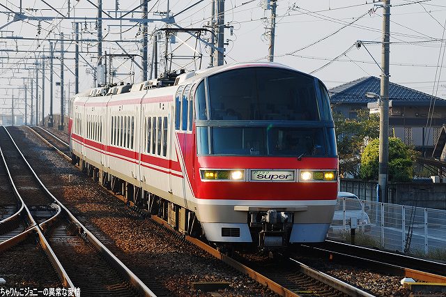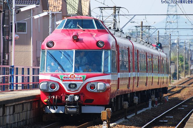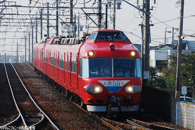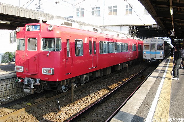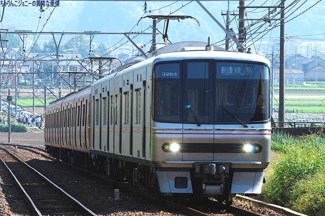 これらの車両は、特急運用から撤退した後に白帯は撤去されたが、前面の行き先表示板は白帯に合わせて変更された小降りなのもがついたままで、異彩を放っていた。 このほど、現在現役に留まっている7000系のうち、最後の「元白帯車」である7011以下4連に白帯が復活し、それを記念する臨時列車が昨日中小田井-三柿野間で運転されたので撮影してきました。 先ずはその前に、定期列車の7000系を撮影すべく早朝の西春駅に展開。 行き交う列車を撮影してウォーミングアップ(^。^;) 土休日朝に設定されている東岡崎発犬山行891列車は、途中の鳴海にて7000系の増結用などとして製造された7700系を連結した6両編成で運転される。 …って、この日は7000系の中間車に運転台を取り付けた、2両編成1本のみの「珍車」7100系が増結されていた。 後続の急行にて一度891列車を追い抜き、布袋駅でもう一度撮影。 ちなみに、6月のダイヤ改正直後に布袋駅にて疎開留置されていた7000系6連×2本は、居なくなっていました。 本命の7000系@白帯車を撮影すべく、羽場駅へ移動。 眼下に見える有名撮影ポイントには既に大勢の同業者が集結しているようだった。「見ろ! 人がゴミのようだ!!」状態?(^。^) そんなこんなで白帯車キター! 系統板は「祝・白帯復活」の特別な物、種別は「団体」をそれぞれ掲出していた。 前後とも展望室は大惨事…もとい!大盛況。特に前部展望室のカメラの砲列が凄い(^。^;)。 この後、三柿野駅にて撮影会が実施されていましたが、同業者が多くて