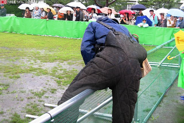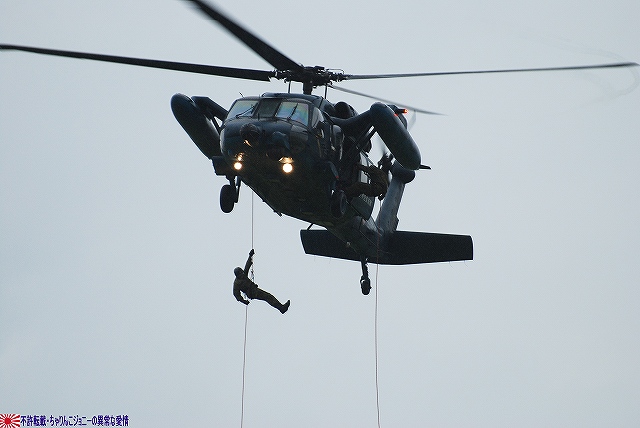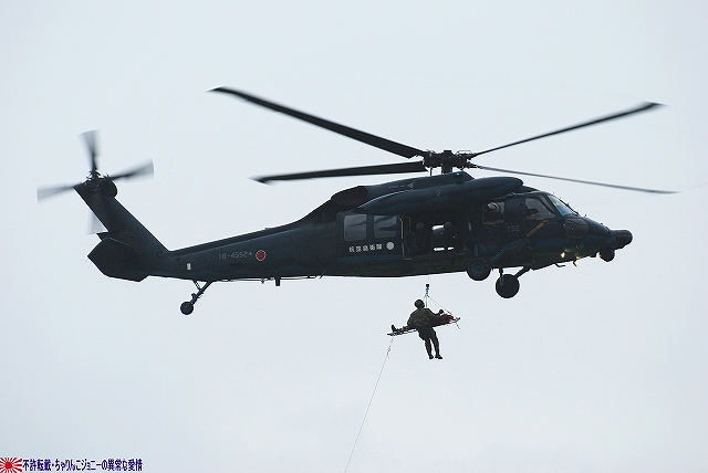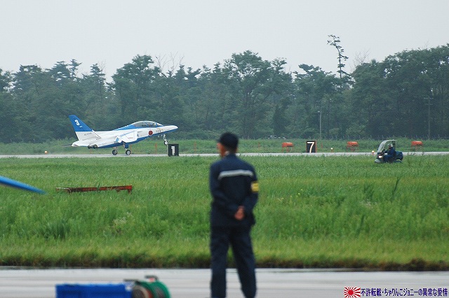 松島基地最寄りの矢本駅へは仙石線で向かうのだが、宿の位置が始発のあおば通駅と仙台駅どちらへも微妙な感じだったので、座れる可能性が高そうなあおば通駅より乗車。 使用されているのは山手線より転属してきた205系電車。 松島基地へは一度行ったことがあるので大体道順は判っていたが、それ以前に同業社がゾロゾロと歩いてゆくので道を知らなくても無問題(^。^) 徒歩移動の途上にて雨が降り始めたので持参してきたポンチョを着用。結局そのまま松島基地を離れるまで着用しつづけることになる。 前日の横田に続き2日連続で雨の航空祭か~… 松島基地にはパイロット養成のためF-2の複座型であるF-2Bが配備されている。 (左)先に離陸した天候観測機と合流してオープニングフライトを実施する為、数機ずつのT-4及びF-2Bがタキシングしていったが…。 (右)…が視界不良の為オープニングフライトは天候観測に上がった2機のみで実施することに。各機はそのままタキシングして戻ってきた。 …と言う事で、松島航空祭では午前と午後の二回のフライトを見ることが出来る。(午前中の飛行は「訓練飛行」。午後の飛行は「展示飛行」名目) 写真は、整備員と敬礼をかわし、パイロットが機体に乗り込むところ。勿論パイロットが着ているポンチョは乗り込む前に脱ぎます。 (左)「訓練飛行」へ向かう各機 (右)パイロットが手を振る やはり視界不良と言う事で、編隊を組んでの「航過飛行」的内容だった。 (左)整備員が見守る中着陸 (右)飛行を終えたパイロットが降りる 松島のF-2による機動飛行は航過飛行へと変更され実施された。 写真はその航過飛行を終えてF-2が着陸した所。 先ずは機動飛行を披露。 (左)リペリング降下にて救難員が地上に降りる。 (中)ストレッチャにて要救助者を吊り上げ中。 (右)同じく救難団のCH-47JAによる放水展示も実施された。 つづく。 本投稿及び添付した写真は私ちゃりんこジョニーの著作物であり、他のサイト・掲示板及びブログ等への無断転載を禁じる。 特に、かつては「中華人民共和国萬歳」現在は「異常な愛情」と言う名のパクりブログを運営している、支那人窃盗常習犯sunbinsiftに対しては強く抗議する。