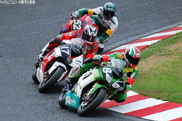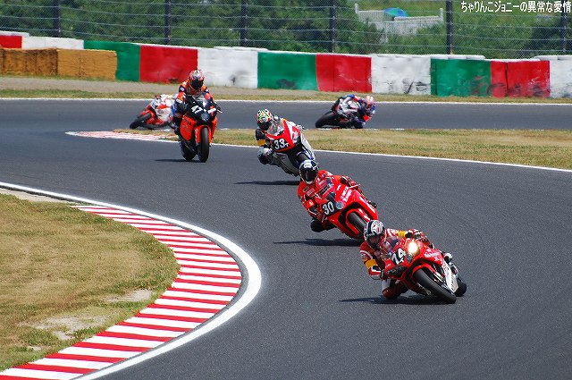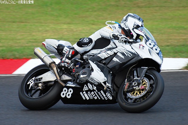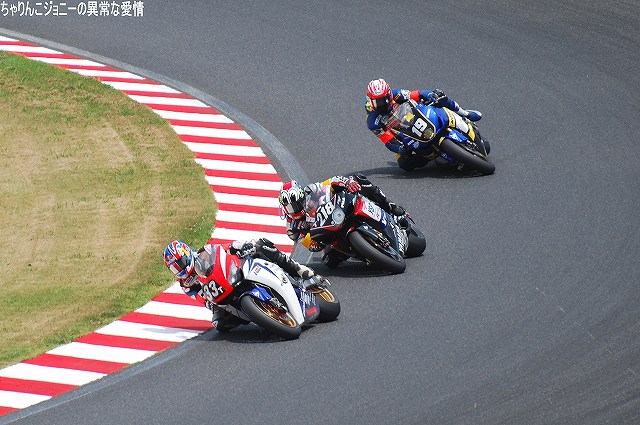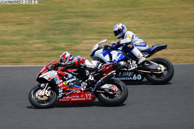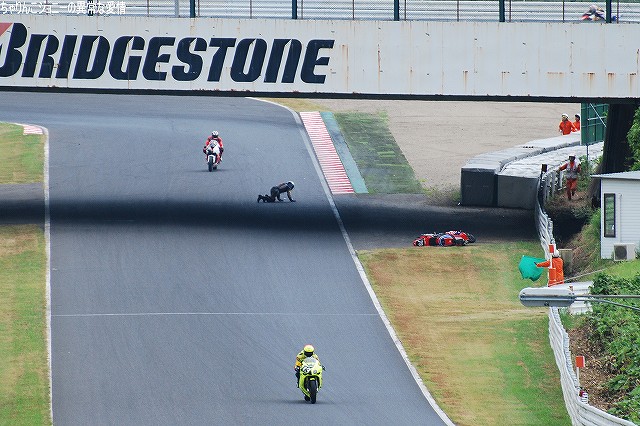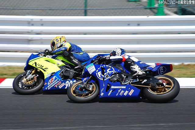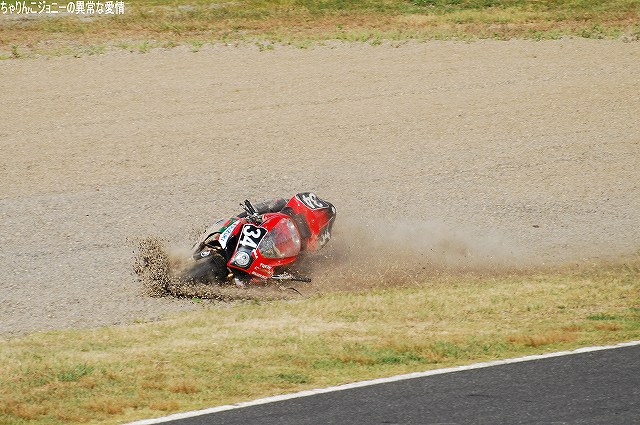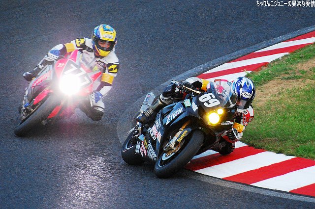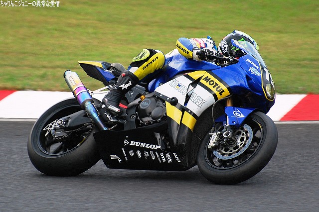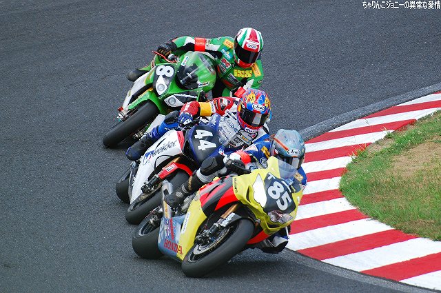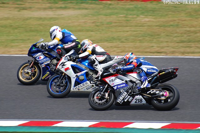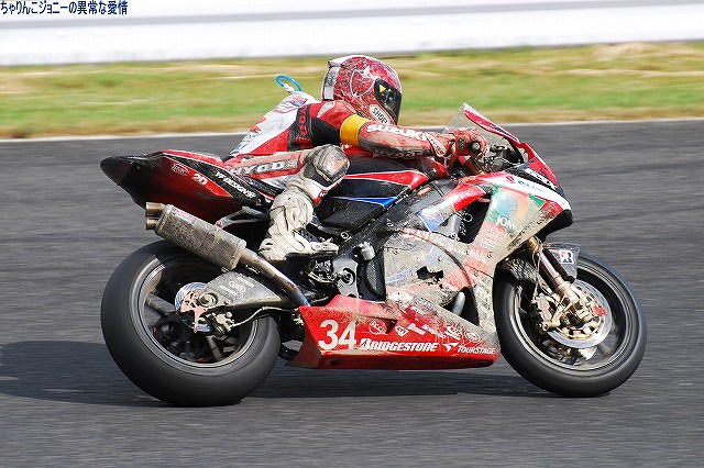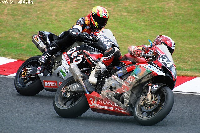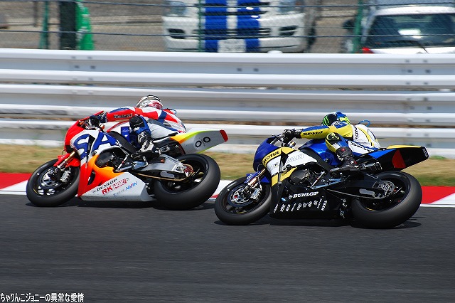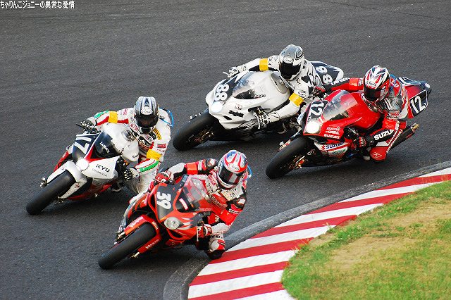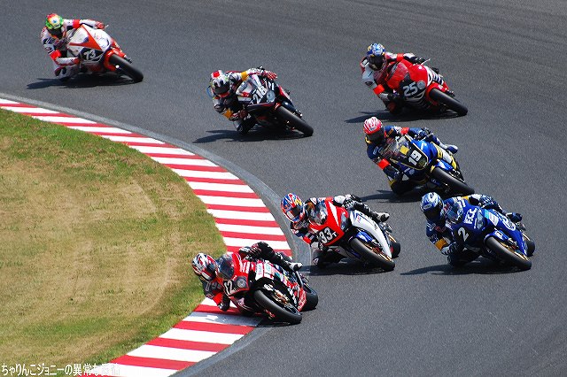 バイクに関する知識が皆無なワタシなので、解説は少なめですがその代わり写真は多目です。 写真はスタート直後の状況で、この前に#11ホンダと#34ヨシムラが居た。 ポールポジションを獲得した#2のTSRだったが、スタートでやや出遅れ、ナンヤカンヤで転倒~リタイヤを喫してしまう。 (右)早くも序盤で転倒するマシンも有った。 逆バンクへ移動。 (左)ホンダ系有力プライベーターの2台、桜井ホンダとモリワキ。 例によって以降はここへ腰を落ち着けて撮影(^。^;) (左)#88はKANSAI YAMAMOTO&angelaのスズキ。 (左)#44はウィダーD.D.BOYS 44のホンダ。 (右)#54はBABIE'S Racing de"LIGHTのドゥカティ。 決勝に登場した唯一の「外車」だったが、残念ながらマシントラブルでリタイヤ。 (左)カワサキの編隊 (左)#39はTEAM茶LLENGERのヤマハ。 (右)#3は世界耐久選手権の参戦マシン。PHASE ONE ENDURANCEのヤマハ。 #19はモリワキホンダ。途中イレギュラーなピットインをしつつ6位入賞を果たした。 …つづく。 |