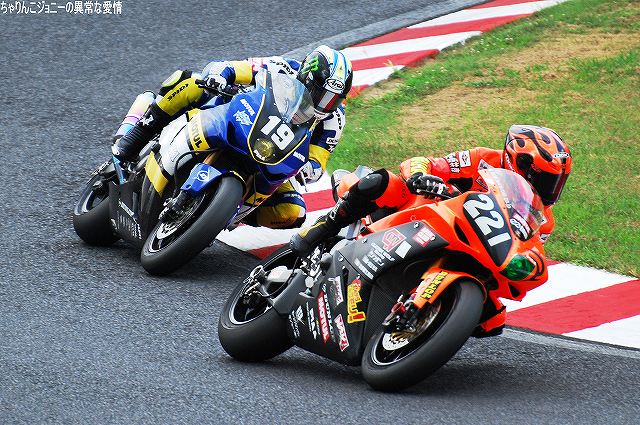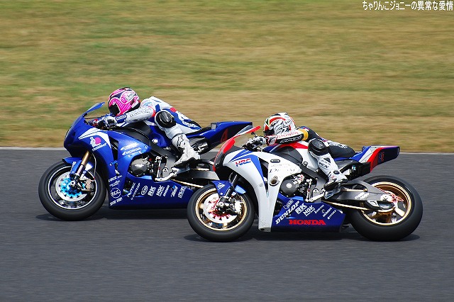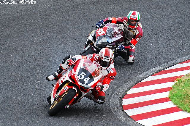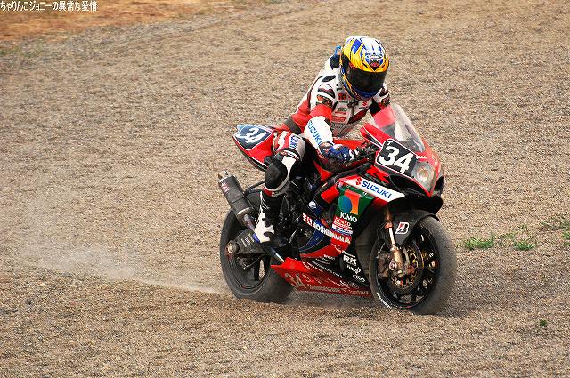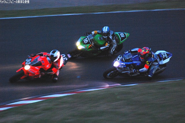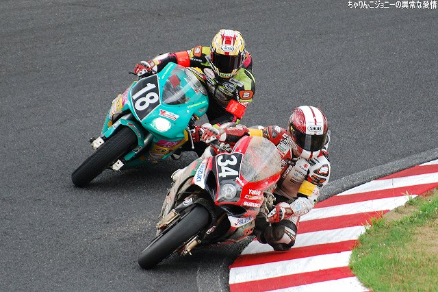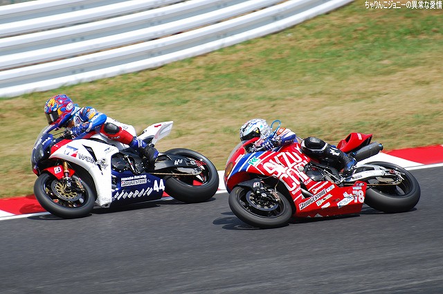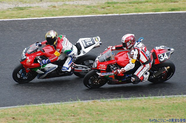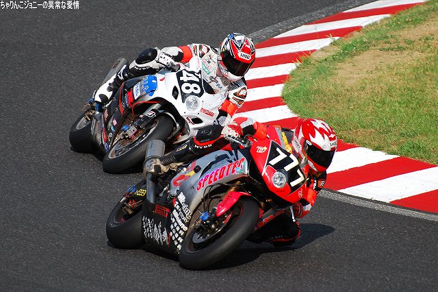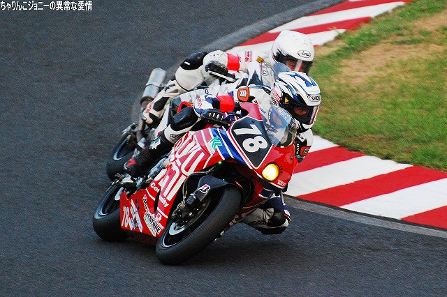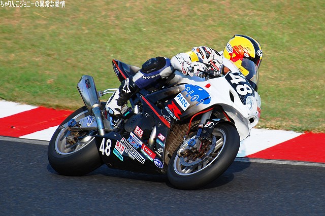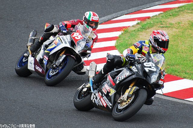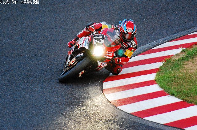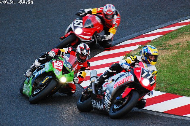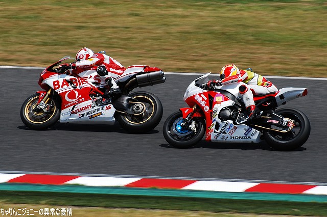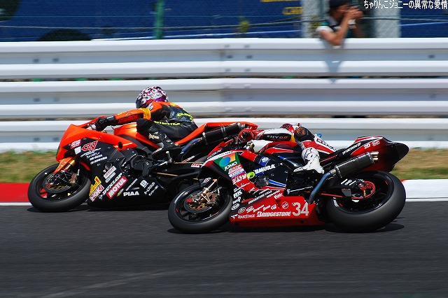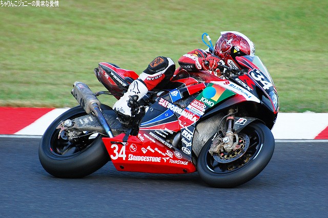 バイクに関する知識が皆無なワタシなので、解説は少なめですがその代わり写真は多目です。 写真はスタート直後の状況で、この前に#11ホンダと#34ヨシムラが居た。 ポールポジションを獲得した#2のTSRだったが、スタートでやや出遅れ、ナンヤカンヤで転倒~リタイヤを喫してしまう。 (右)早くも序盤で転倒するマシンも有った。 逆バンクへ移動。 (左)ホンダ系有力プライベーターの2台、桜井ホンダとモリワキ。 例によって以降はここへ腰を落ち着けて撮影(^。^;) (左)#88はKANSAI YAMAMOTO&angelaのスズキ。 (左)#44はウィダーD.D.BOYS 44のホンダ。 (右)#54はBABIE'S Racing de"LIGHTのドゥカティ。 決勝に登場した唯一の「外車」だったが、残念ながらマシントラブルでリタイヤ。 (左)カワサキの編隊 (左)#39はTEAM茶LLENGERのヤマハ。 (右)#3は世界耐久選手権の参戦マシン。PHASE ONE ENDURANCEのヤマハ。 #19はモリワキホンダ。途中イレギュラーなピットインをしつつ6位入賞を果たした。 …つづく。 |