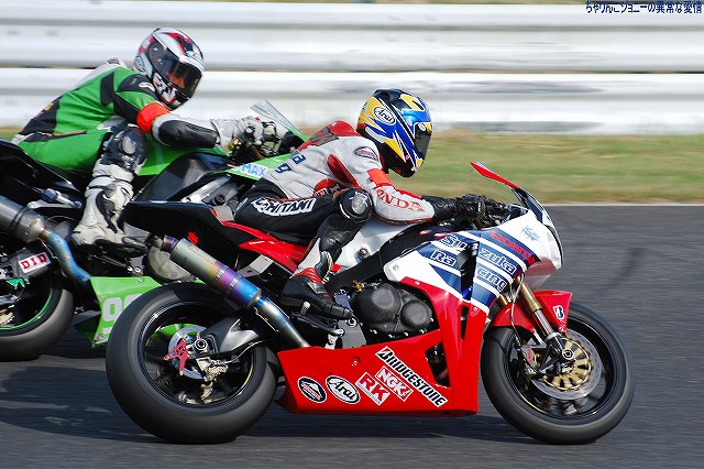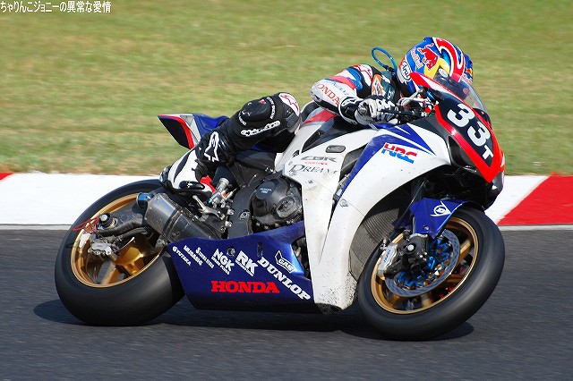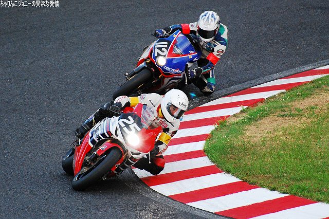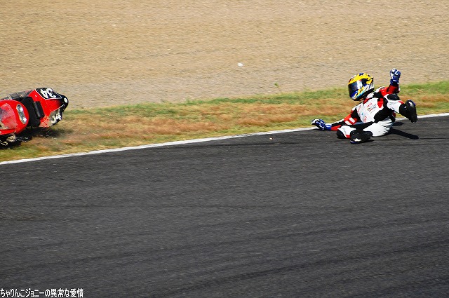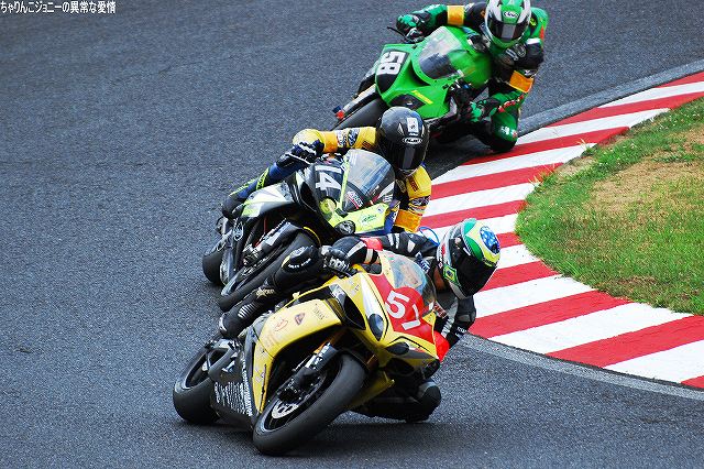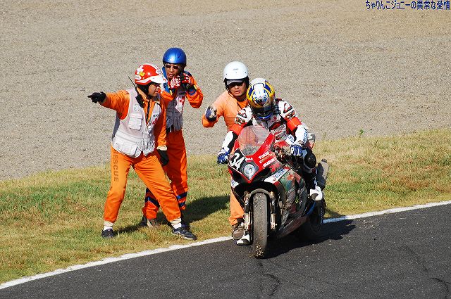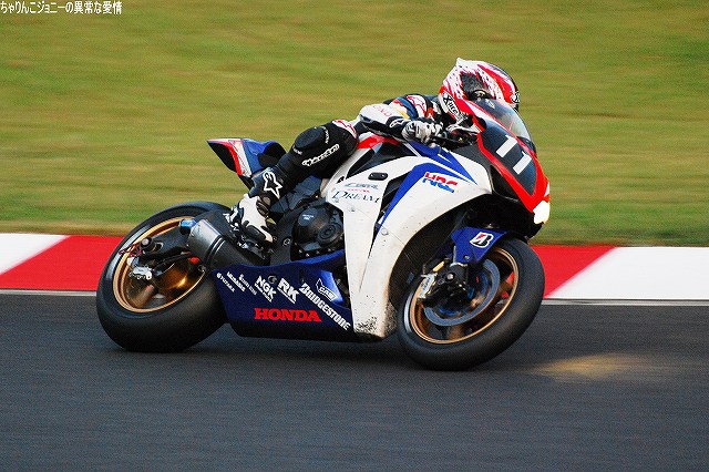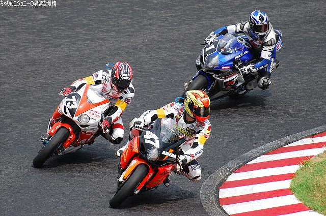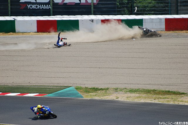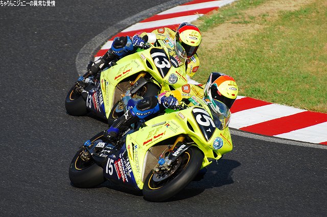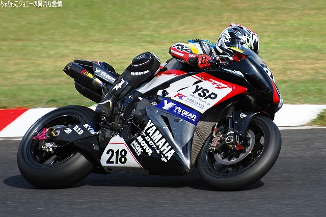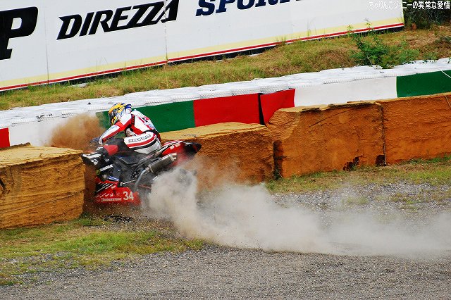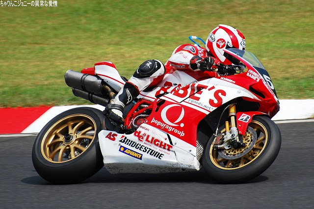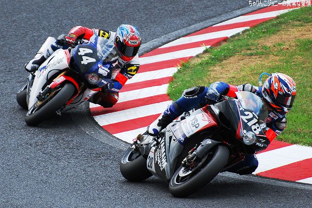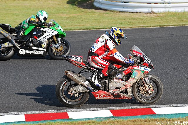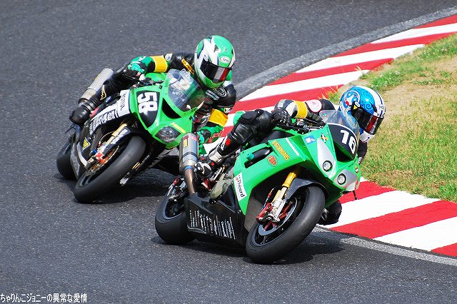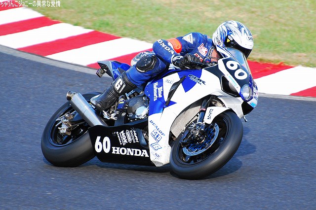 バイクに関する知識が皆無なワタシなので、解説は少なめですがその代わり写真は多目です。 写真はスタート直後の状況で、この前に#11ホンダと#34ヨシムラが居た。 ポールポジションを獲得した#2のTSRだったが、スタートでやや出遅れ、ナンヤカンヤで転倒~リタイヤを喫してしまう。 (右)早くも序盤で転倒するマシンも有った。 逆バンクへ移動。 (左)ホンダ系有力プライベーターの2台、桜井ホンダとモリワキ。 例によって以降はここへ腰を落ち着けて撮影(^。^;) (左)#88はKANSAI YAMAMOTO&angelaのスズキ。 (左)#44はウィダーD.D.BOYS 44のホンダ。 (右)#54はBABIE'S Racing de"LIGHTのドゥカティ。 決勝に登場した唯一の「外車」だったが、残念ながらマシントラブルでリタイヤ。 (左)カワサキの編隊 (左)#39はTEAM茶LLENGERのヤマハ。 (右)#3は世界耐久選手権の参戦マシン。PHASE ONE ENDURANCEのヤマハ。 #19はモリワキホンダ。途中イレギュラーなピットインをしつつ6位入賞を果たした。 …つづく。 |