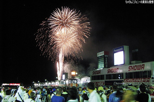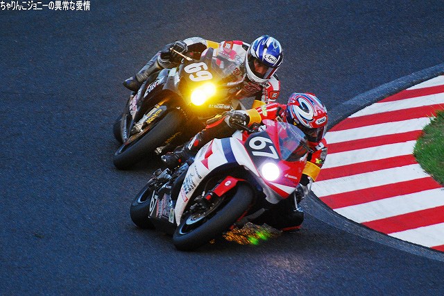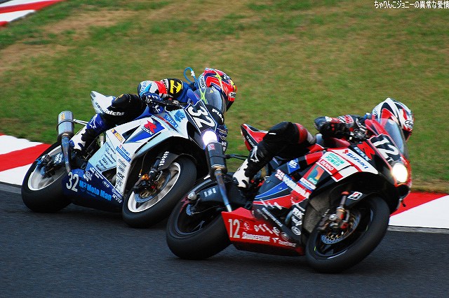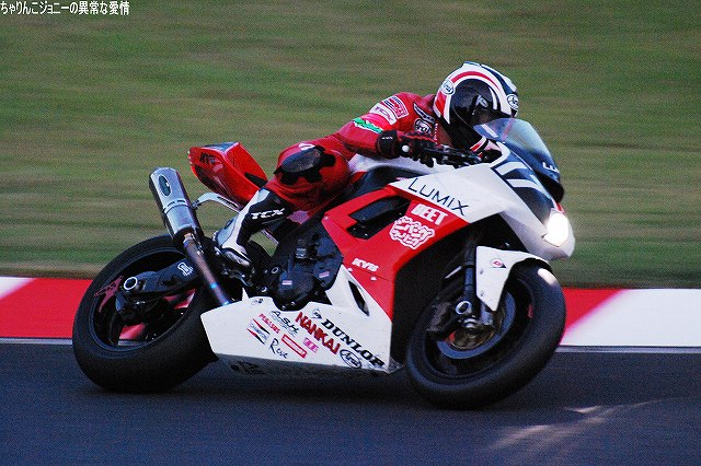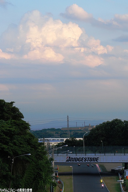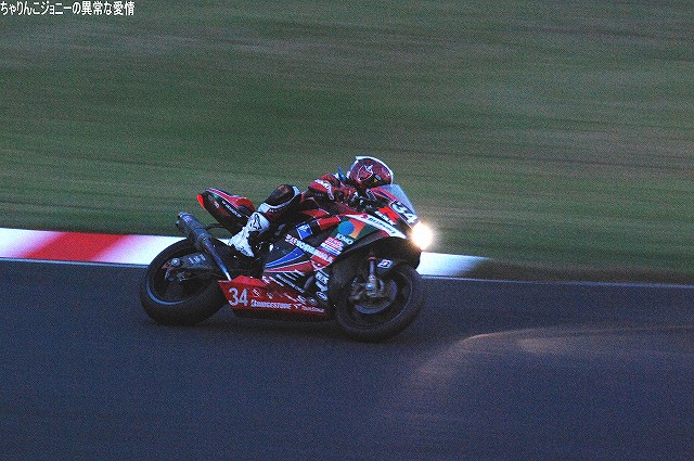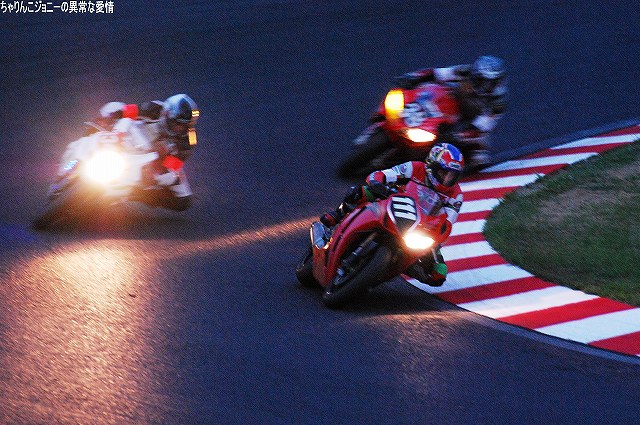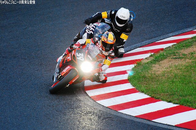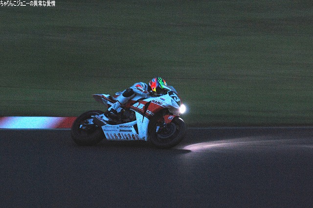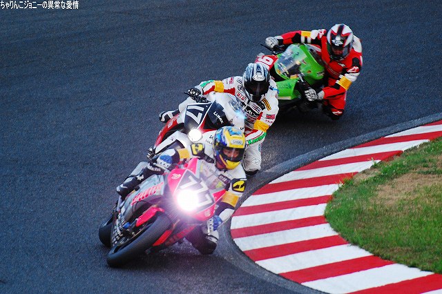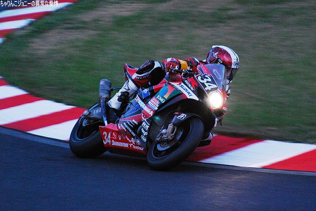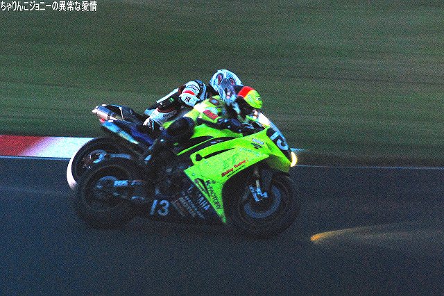 あれだけ厳しかった日差しがようやく弱まって来るころになると、ライトオンのサインを待たずして各車がヘッドライトを点灯し始め、8耐独特の光景が展開される。 (左)このレースに勝利したのは#11のワークスホンダ 清成/チェカ組。 (右)2位に入ったのは#12のヨシムラスズキ 酒井/渡辺組 現在イギリスを拠点に活動中の渡辺篤選手は、場内放送で「世界のナベアツ」と紹介されていた(^。^) (右)#17は、BEET LUMIX RACING ジパツーのカワサキ。 (右)#57は世界耐久選手権の参戦チーム。TEAM LTG #57のヤマハ。 暗く成ってくるにしたがって、当然ながら撮影条件も厳しくなってくる。 (左)#100はは世界耐久選手権の参戦チーム。TEAM ENDURANCE MOTO 45のスズキ。 (右)転倒が相次いだ#34のヨシムラだが、それでも4位入賞を果たしたのは流石。 (左)#10は桜井ホンダの亀谷/ハスラム組で9位完走。 もう一台の桜井ホンダである#71津田/ブルックス組は10位完走。 暗くなってからも力走は続く…。 (左)レース終了。 表彰式を見ようと、解放されたホームストレートには多くのファンが降りて来た。勿論ワタシもその一人。 (右)最後は花火で締めくくり。 この秋より鈴鹿のメインスタンド及びピット/パドックエリアは全面改装工事に入るため、現行の建物と花火との組み合わせは今年で見納め。 最後になりましたが当日現地にてお世話になった皆さん有り難うございました。 色々有った回ですが… スタートから3時間を過ぎた辺りで、雷鳴と共に西コースから大粒の雨が降り始める。 程なく雨はコース全域へと広がり、場内放送では丘の上など高い場所で完成している観客への避難が呼びかれられた。 当然ながら多くの車両がペースダウン。コースが斑点状に濡れているヘアピンでもペースを落とした各車が通常よりも浅いバンク角にて通過してゆく姿が見られた。 (左)立体交差下付近で一台転倒。 (右)各車がペースを落とす中、唯一ペースを落とす事無くそれまで独走態勢を築きつつあった#11のホンダを猛然と追い上げたのが、2位を走行中だった#34のヨシムラ。 そのかいあって一時はトッフに立つものの、雨に濡れた1コーナーで転倒。再び#11の先行を許すものの傷ついたマシンもそのままにすぐさまレースへ復帰した。 (左)#7はヤマハ・オーストラリアのマシン (左)スズキの編隊 (右)#25はホンダ鈴鹿レーシングのマシン なおもホンダを追撃する#34のヨシムラ。波乱を呼んだ雨は直ぐに止み、再び鈴鹿に夏の日差しが戻ってくる。 (左)#73はHARC-PRO.のホンダ。プライベーターながら3位表彰台を獲得した。 (右)#218はヤマハレーシングのマシン。 今年のヤマハワークスは1台のみの参戦。若手コンビで5位入賞を果たした。 (左)#90は世界耐久選手権の参戦チーム、TEAM RUNNER BIKEのカワサキ。 (右)#33はもう一台のホンダワークス。レース中盤一時は3位に上がるものの、転倒~マシン炎上によりリタイア。 (左)#34のヨシムラが今度はヘアピンで転倒。 (右)グラベル上を滑ってゆくマシン。左のハンドルが折れてしまっているよう。 それでもレースを諦めない… (右)#13と#15はチーム・エッジングファクトリーのヤマハ。 ヘルメットまで蛍光イエローで揃えてあるので、編隊を組むとインパクト大。 (左)修復成った#34のヨシムラがコースに復帰。カウルなどが交換されたがマシンの一部には転倒の傷跡が残る。 (右)#60はHonda ブルーヘルメットMSCのマシン。 #34のヨシムラが今度はヘアピンを直進する形でクラッシュ。 修復されたとはいえマシンには転倒の後遺症が有ったのかも? …つづく
