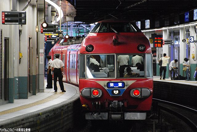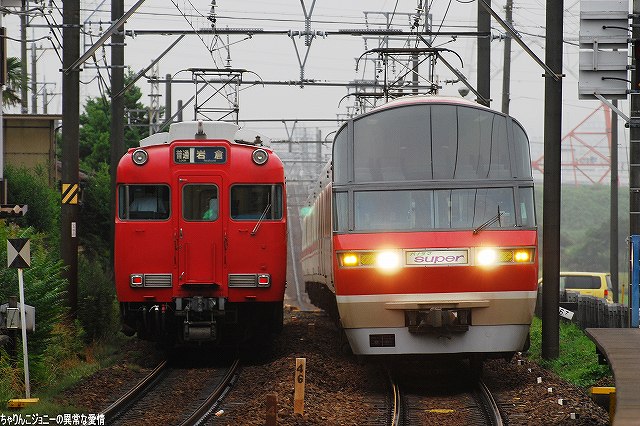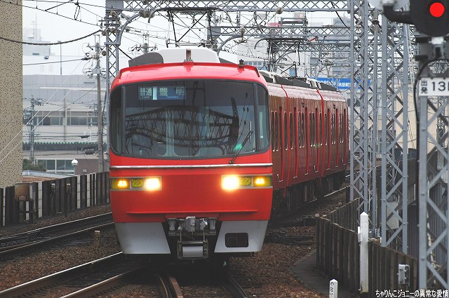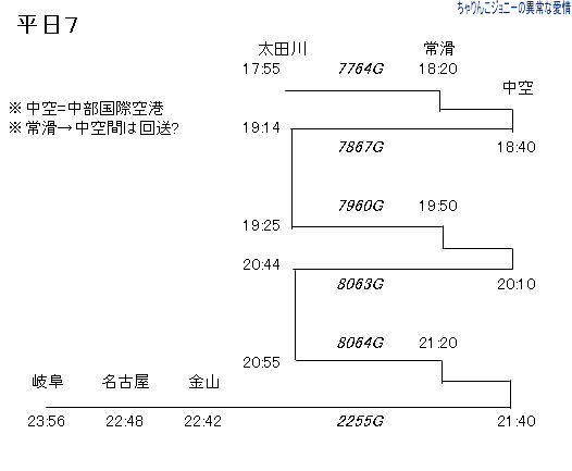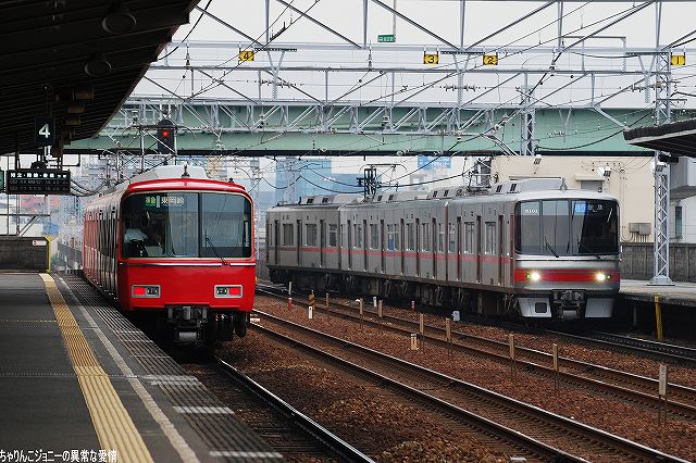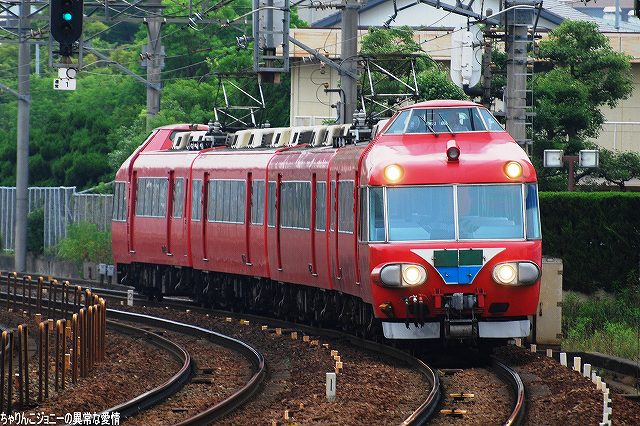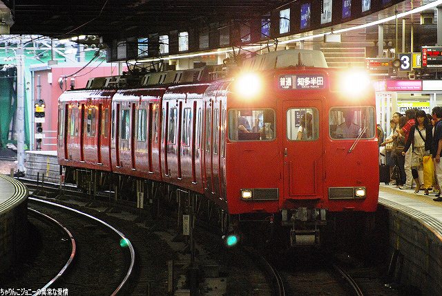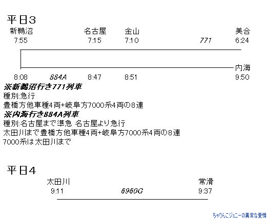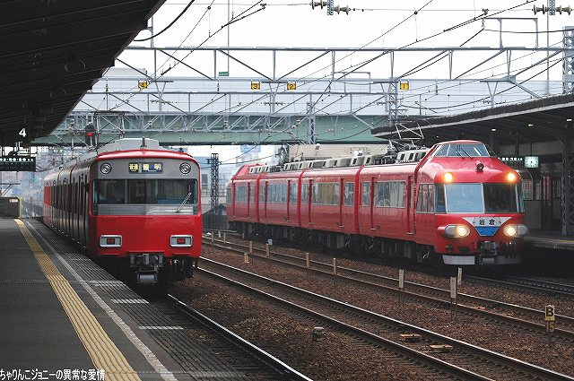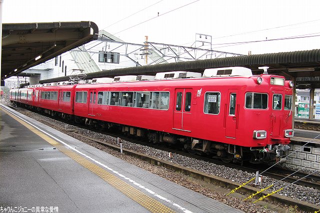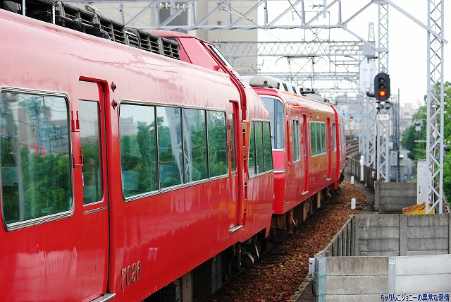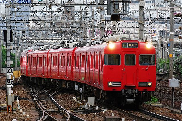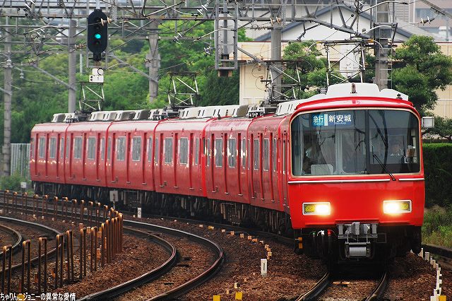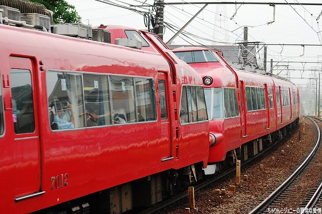ひっさしぶりにエクセル使ったので、お見苦しい点が多々有ったりするのはご勘弁を。 が、その前に…ホントはこんなん書きたくないのですが念のため… ご注意 名鉄HP似て発表の7000系基本運転時刻表(平日 H20/6/29現在)を参考に、想像で組んだ運用表(らしきもの)です。 あくまで個人的に作成したものですので、間違い等有った場合はご勘弁を。また、ご利用は自己責任で願います。 本表のとうり運用が組まれていなかったり、 7000系が来たり来なかったりしても、当方は一切責任を持ちません。 平日…の運用番号は便宜上ワタシが勝手につけたものです。 斜体表記は列車番号です。 形式/種別/両数は、特記の無い限り7000系/普通/4両です。 検査の都合により、別の車種/両数で運行することがあるそうです。 ルールやマナーを守り撮影しましょう 運用をざっと見ると、ダイヤ改正までは「ハイライト」だった犬山-常滑線系統の急行運用がごっそり無くなり、同時に広見線及び各務ヶ原線への乗り入れもなくなってしまいました。 もうひとつの「ハイライト」と言える朝の8連運用は、他形式との併結…と言うカタチながら残置された模様。 中部国際空港への出入りは夕方~夜間のみ。 撮影が比較的容易そうなのは、犬山/岩倉-豊明/東岡崎の普通列車かな? 2運用あるので、何処かですれ違ったりする筈です。 …休日編はまたそのうち(^。^;) 写真は1600系による「西尾特急」。夕方の時間帯は佐屋-吉良吉田間に運転区間が延長されていた。 1380系の犬山行き普通がやって来た。 (左)5700系4連による東岡崎行き普通。 (右)6800系後期型以下4両の東岡崎行き普通(さっきから東岡崎行きの写真ばっかしやな!)と1600系の佐屋行き特急が擦れ違う。 ちゃんと踏切を渡ってお利口さん…と言いたいところだが、行き(画面左手からから右手方向へ向けての移動)は遮断機が下りて特急が接近中、と言う状況にもかかわらず平然と線路を横切ってゆき、見ていたワタシと友人を大いにアセらせてくれた。 7000系6連の豊川稲荷行き急行がやって来た。 1961(昭36)年より1975(昭50)年までに合計116両、続いて増備された改良型の7500系75両と共に、文字通名鉄の「顔」として活躍してきた「パノラマカー」も、この6/29のダイヤ改正以降は4両編成×3本=12両を残すのみとなる見込みで、その12両も平成20年度中には引退すね予定だそう。 最後になりましたが、当日現地にてお世話になった皆さん有り難うございました。 写真は岐阜行き快速急行として到着した7000系パノラマカー。 地下に作られている名鉄名古屋駅は、2線3面という大手私鉄の中心駅としては特異と言って良いほど規模の小さな駅で、上下線間に挟まれたホーム(写真では向って左側)を降車及び特急特別車の乗車ホーム、上下線の外側のホーム(同向って右側)を乗車ホームとし、さらに行き先や種別によって停車(=乗車)位置をずらす事により、多方面のよき先へと向かう多くの列車を捌いている。 0~16時の間は特急の特別車にも乗車できる1DAYフリーきっぷ利用ならではの行程、と言う事で、6/29のダイヤ改正にて廃止される「西尾特急」に乗って名古屋-西尾間を往復してみる。 動画・新安城-南安城 新安城より名古屋本線から別れて単線の西尾線を走行する、1000系パノラマスーパーの展望席より撮影。 写真は西尾-蒲郡間で使用される、「西尾線ワンマン仕様」の6000系。 「三河線ワンマン仕様」が、ホームセンサー対応/(無人駅の自動化により)料金箱ナシ…と言う内容なのに対し。西尾線ワンマン仕様車は駅施設の違いによりホームセンサー非対応/料金箱アリ…など、ワンマン運転用改造車両としては一般的な内容をもつ。 「西尾特急」には1000系の他1600系も使用されていた。 動画・金山-名鉄名古屋 一部特別車編成の展望車は豊橋方のみなので、岐阜方の展望席より撮影の映像は全車特別車編成全廃後は貴重になるかな? 名古屋本線国府宮-島氏永間へ移動。 水田が広がるこの区間は名古屋本線沿線では屈指の撮影ポイントなのだが、この区間を走る7000系の運用は少なく、写真の豊川稲荷行き急行の運用も日替わりで有ったり無かったりするものだそう。(7000系で無い時は他形式が走る) 名古屋本線堀田駅へ移動。 7000系+5300系の普通がやって来た。 (左)6500系(左側)と5000系(右側) (右)1600系の回送列車と6000系。 (左)パノラマスーパーの全車特別車編成 (右)1380系の豊明行き普通。 7000系の犬山行き普通。 7000系の岩倉行き普通。 平日の16時代には(15分間隔で)2本続けて7000系の普通列車がやって来ていた。 つづく。 細長くて 「目」がよっつ いったい なぁ~んだ? もとい、名鉄7000系パノラマカー …と言うことで飽きもせずにこの日も1DAYフリーキップにて撮影してきました。 (^。^;)ナンヂャソラ! 手前側の7100系は7000系の中間車を先頭車改造した形式で2両編成1本のみが在籍。 奥の7700系は7000系の増結用として製造された形式で、現在は2連×8本が在籍。 両形式とも全車が所謂「三河線ワンマン」対応改造を受け、主に三河線に