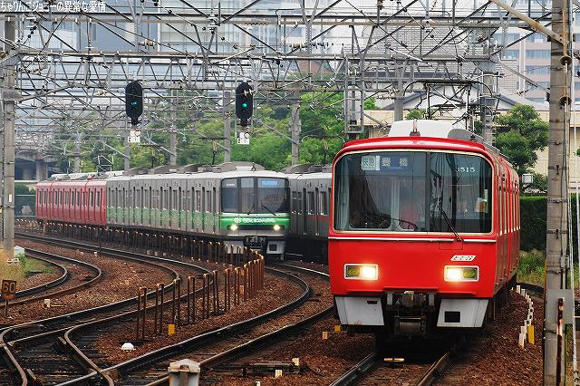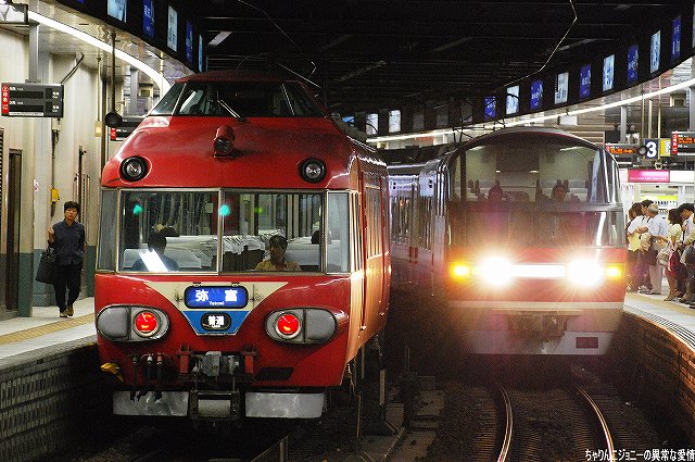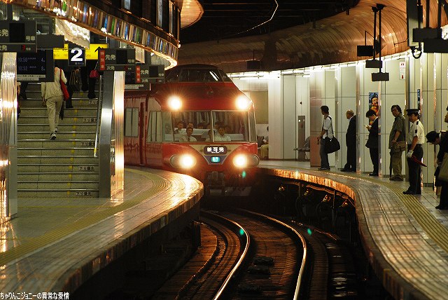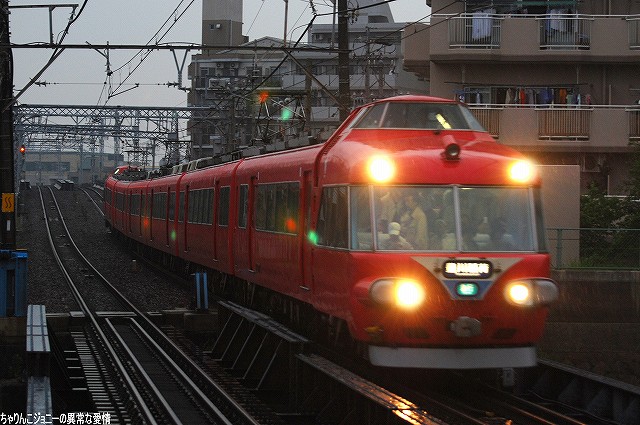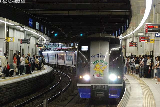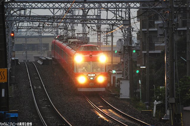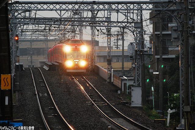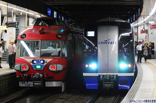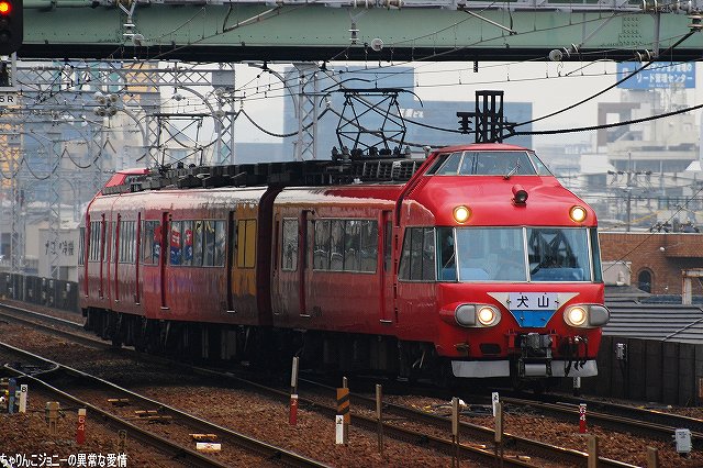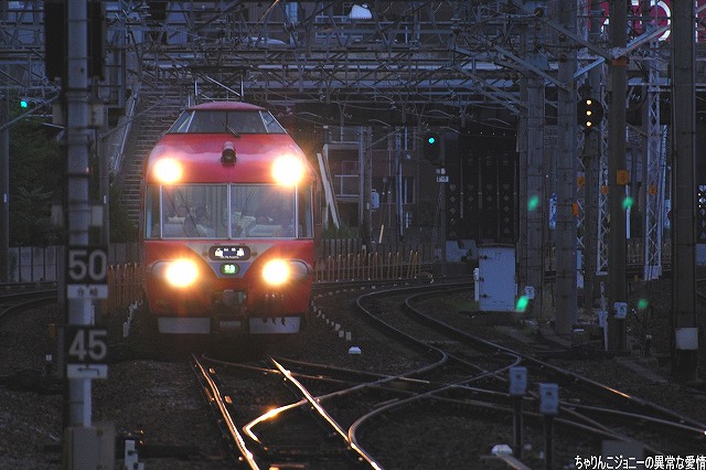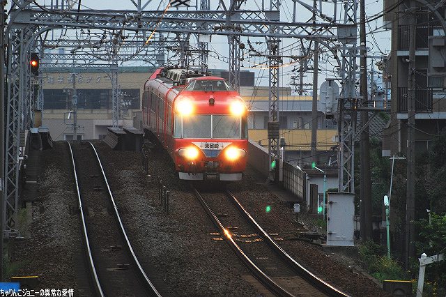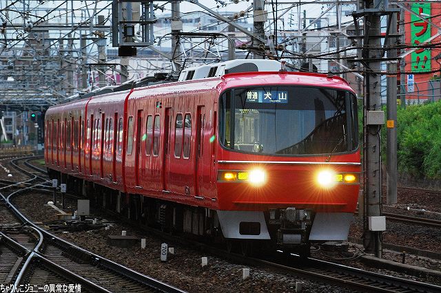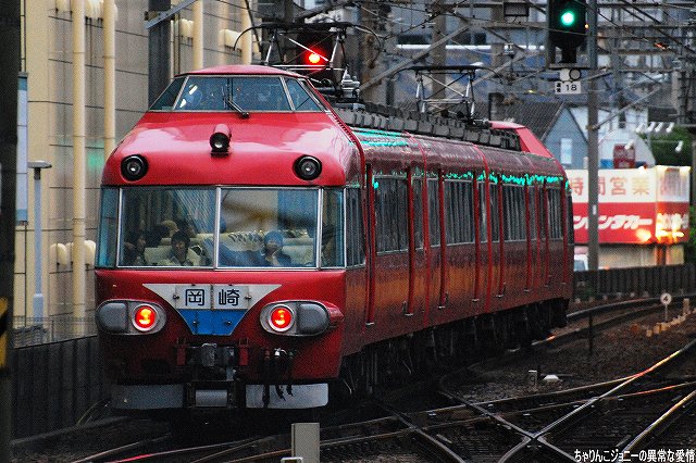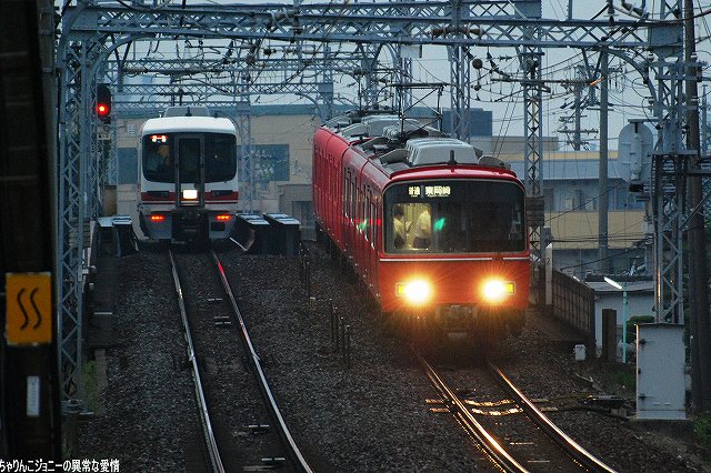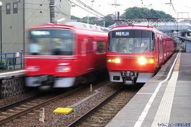 名古屋を中心に放射状に路線を伸ばす名鉄の、各系統の列車が集中するチョークポイントに有る同駅にて、夕闇迫る中やって来る列車を片っ端から撮影する。 (左)神宮前方より金山駅へ進入する1000系パノラマスーパー4連(=全車特別車編成) 神宮前-金山間は複々線区間。 (右)6000系等による新可児行き急行。 この6000系は大型の行き先方向幕と開閉可能で非連続な側窓を持つタイプ。 (左)金山を後にする1600系と7000系が擦れ違う。 1600系は一部特別車編成へと改造のため6/29のダイヤ改正より一時運用を離れるそう。 (右)金山へ進入してくる7000系。 この7011以下の4連は、元は特急用の特別仕様車で、特別仕様車の証であった白帯を撤去した後も、白帯用に小型化された前面の行き先表示板はそのまま残っており独特の表情をしている。 (左)2000系ミュースカイ4連 (右)6000系4連を使用した知多半田行き普通。 この6000系は大型の行き先表示幕と連続した固定窓を持つタイプ。 (左)7000系を使用した弥富行き普通と、1000系パノラマスーパーが並ぶ。 (右)弥富行き普通は後続列車との接続/退避の為10分程金山に停車した後出発してゆく。 本形式は2004(平14)年に踏み切り事故に遭ったパノラマスーパーの一部特別車編成のうち、ダメージの少なかった一般席(自由席)車を再生させた編成。 再生にあたっては、豊橋/常滑方に運転台を新設、塗装の赤一色化等が行われたが、車内は基本的にそのままのよう。 当然ながら1編成4両のみの形式なので、他の形式とは区別された運用が組まれていたようだが、この春より性能及び設備的に似通っている5000系が増備されていることから、近い将来にそれらと共通運用が組まれたりするのかなー?と妄想。 (左)今度は犬山経由岐阜行き準急として7000系がやって来た。 (右)ミュースカイとの新旧スターの並び…と言うか7000系は今もスターか。 名鉄は、空港特急であるミュースカイを除く特急列車は全て一部特別車編成とする「特急施策の見直し」を打ち出しており、この1000系全車特別車編成は順次廃車され、足回りなど一部機器を再利用し5000系通勤型電車が作られている。 ポケモンラッピング車2題 (左)2200系 (右)2000系 メモリとバッテリさえ用意すれば(フイルム代や現像代などを気にする事無く)無尽蔵に撮影を行え、夜間などでもとりあえず写しさえすれば、画像は後からナントカ出来たりするデジカメを装備したことにより、この日のように早朝から日没まで断続的に撮影を続行…何て事も可能になったわけですが、12時間以上に及ぶ「作戦行動」で流石にもうクタクタなのでこれにて撤収する事に…。 テクノロジーの進歩は、必ずしも人間を苦役から解放しないんだな~、と言うのがこの日得た教訓でした(^。^;) (勿論、誰に強制された訳でもなく、自分の意志に於いてやってることなので、イヤなら止めとけば良いだけの話なんですけどね(^。^)) |